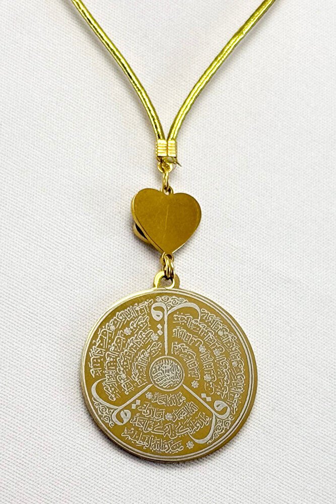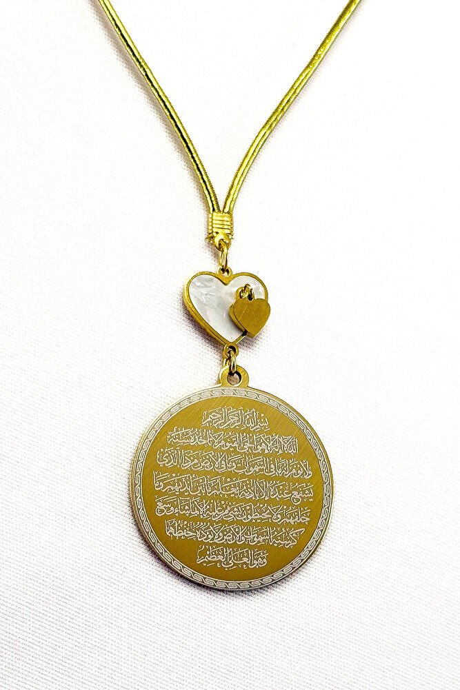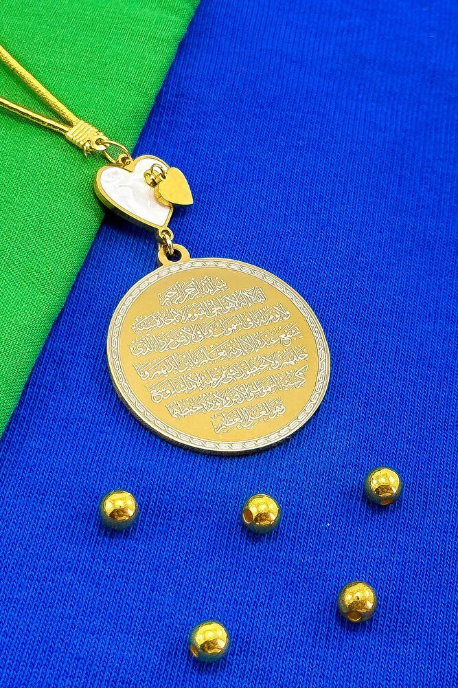 Dualar lazer kazıma tekniği ile kalıcı bir şekilde kazınmaktadır.; Sedefli hareketli kalp çeliktir ve tek taraflıdır.; Ayetel kürsi yazılı yüzünde bulunmaktadır.; Ürün el yapımıdır el yapımı olduğu için ufak farklılık ve düzensizlikler olasıdır.; İp elastiktir.; Elastik olduğu için her modele rahatlıkla takılabilmektedir.; Plaka altın renkli paslanmaz çeliktir.; Ürün üzerinde bulunan metaller komple paslanmaz çeliktir.; Çelik plaka 3,5 cm ölçülerindedir.; Plaka çift taraflıdır.; Bir yüzünde Ayetel Kürsi diğer yüzünde ise Felak Nas İhlas bulunmaktadır.; Felak, Nas ve İhlas sureleri, İslam inancında korunma ve manevi güç sağlamak için okunan önemli dualardır.; İnanılır kabul edilir ki, Felak ve Nas sureleri, özellikle kötü gözlerden, nazardan ve şeytani etkilerden korunmak için okunur.; Felak suresi, karanlık güçlere karşı koruma sağlarken, Nas suresi de olumsuz düşünceler ve zararlı enerjilerden korunmayı sağlar.; İhlas suresi ise, Allah ın birliğini ve sınırsız gücünü ifade eder, bu sureye inanılır ki, kişi manevi huzur ve Allah ın koruması altında olur.; Bu sureler, sıkça güven ve huzur arayışında olanlar için okunur ve ruhsal dengeyi sağlamak isteyenlere büyük fayda sağladığına inanılır.; Ayetel Kürsi, İslam inancında en güçlü ve koruyucu dualardan biri olarak kabul edilir.; Ayetel Kürsi, Allah ın büyüklüğünü ve egemenliğini ifade eden bir ayet olup, koruma ve manevi güç sağlamak amacıyla sıkça okunur.; Bu ayet, göklerde ve yerin her şeyinin Allah a ait olduğunu vurgular ve şeytani etkilerden korunma sağlar.; Özellikle gece yatmadan önce okunmasının, güvende olma, zararlı enerjilerden korunma ve ruhsal huzur sağlama açısından büyük fayda verdiğine inanılır.; Aynı zamanda, Allah ın her şeyi bildiği ve her şeyin O na bağlı olduğu inancı ile kişiye manevi rahatlık ve güç verir.;