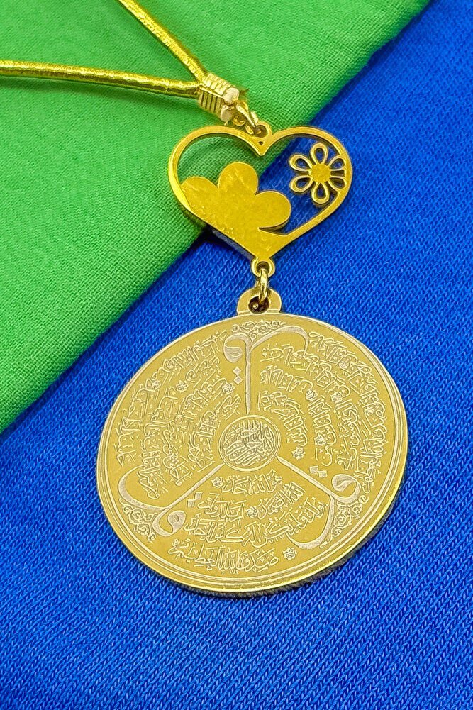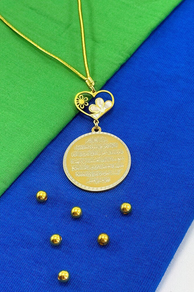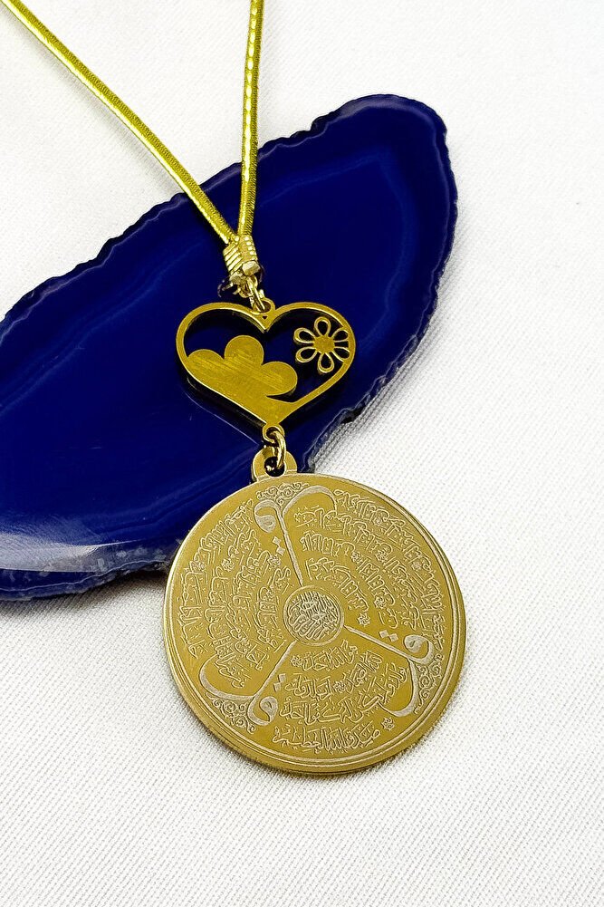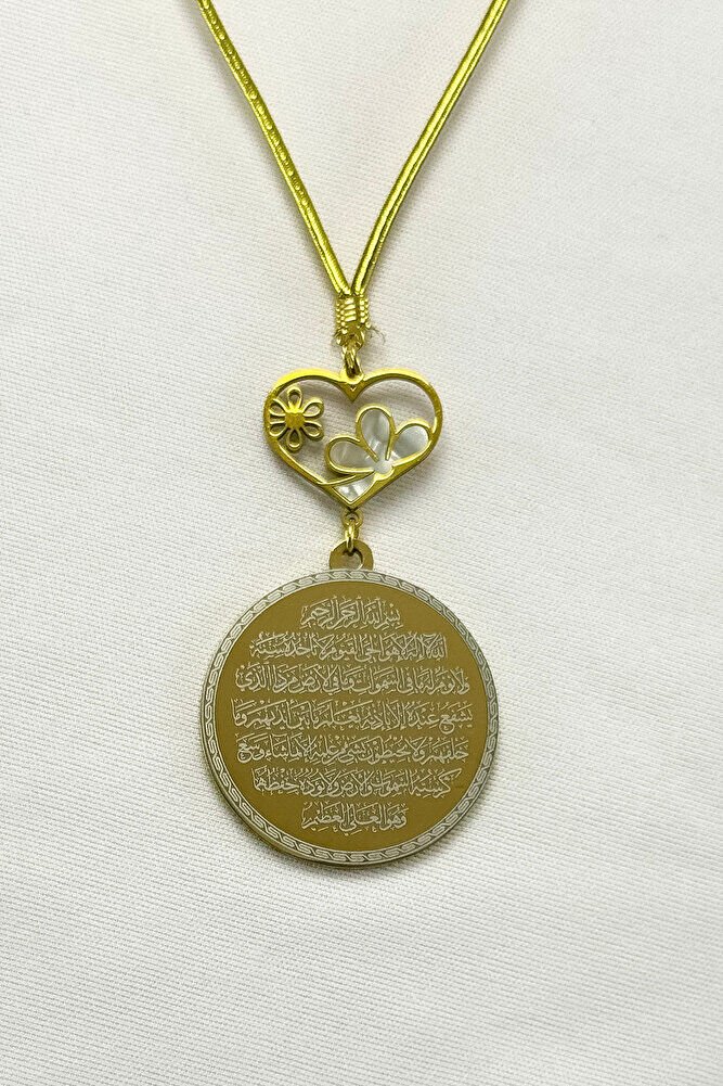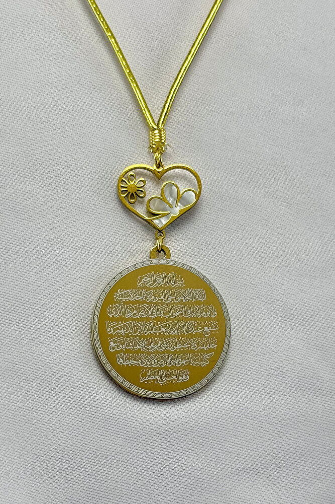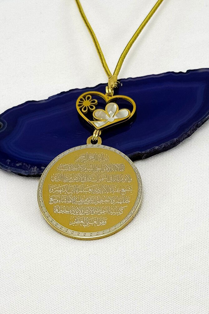 Dualar lazer kazıma tekniği ile kalıcı bir şekilde kazınmaktadır.; Sedefli çiçek detaylı kalp paslanmaz çeliktir ve tek taraflıdır.; Ayetel kürsi yazılı yüzünde bulunmaktadır.; Ürün el yapımıdır el yapımı olduğu için ufak farklılık ve düzensizlikler olasıdır.; İp elastiktir.; Elastik olduğu için her modele rahatlıkla takılabilmektedir.; Plaka altın renkli paslanmaz çeliktir.; Ürün üzerinde bulunan metaller komple paslanmaz çeliktir.; Çelik plaka 3,5 cm ölçülerindedir.; Plaka çift taraflıdır.; Bir yüzünde Ayetel Kürsi diğer yüzünde ise Felak Nas İhlas bulunmaktadır.; Felak, Nas ve İhlas sureleri, İslam inancında korunma ve manevi güç sağlamak için okunan önemli dualardır.; İnanılır kabul edilir ki, Felak ve Nas sureleri, özellikle kötü gözlerden, nazardan ve şeytani etkilerden korunmak için okunur.; Felak suresi, karanlık güçlere karşı koruma sağlarken, Nas suresi de olumsuz düşünceler ve zararlı enerjilerden korunmayı sağlar.; İhlas suresi ise, Allah ın birliğini ve sınırsız gücünü ifade eder, bu sureye inanılır ki, kişi manevi huzur ve Allah ın koruması altında olur.; Bu sureler, sıkça güven ve huzur arayışında olanlar için okunur ve ruhsal dengeyi sağlamak isteyenlere büyük fayda sağladığına inanılır.; Ayetel Kürsi, İslam inancında en güçlü ve koruyucu dualardan biri olarak kabul edilir.; Ayetel Kürsi, Allah ın büyüklüğünü ve egemenliğini ifade eden bir ayet olup, koruma ve manevi güç sağlamak amacıyla sıkça okunur.; Bu ayet, göklerde ve yerin her şeyinin Allah a ait olduğunu vurgular ve şeytani etkilerden korunma sağlar.; Özellikle gece yatmadan önce okunmasının, güvende olma, zararlı enerjilerden korunma ve ruhsal huzur sağlama açısından büyük fayda verdiğine inanılır.; Aynı zamanda, Allah ın her şeyi bildiği ve her şeyin O na bağlı olduğu inancı ile kişiye manevi rahatlık ve güç verir.;