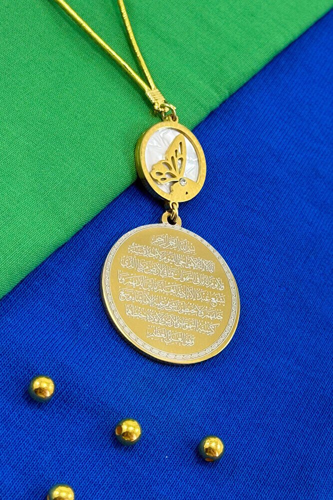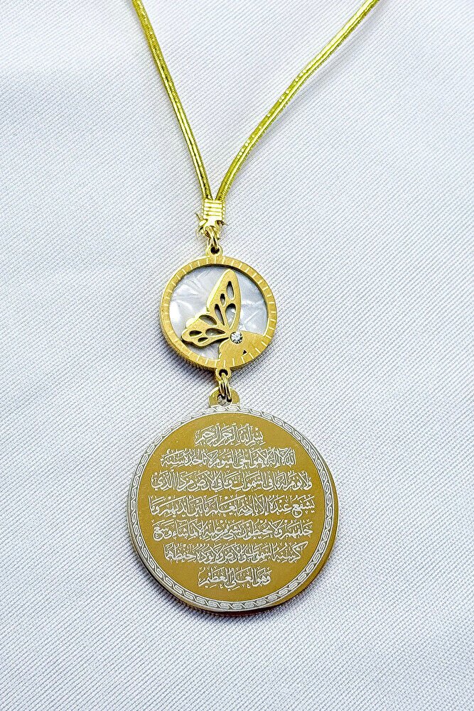 Dualar lazer kazıma tekniği ile kalıcı bir şekilde kazınmaktadır.; Sedefli kelebek çeliktir ve tek taraflıdır.; Ayetel kürsi yazılı yüzünde bulunmaktadır.; Ürün el yapımıdır el yapımı olduğu için ufak farklılık ve düzensizlikler olasıdır.; İp elastiktir.; Elastik olduğu için her modele rahatlıkla takılabilmektedir.; Plaka altın renkli paslanmaz çeliktir.; Ürün üzerinde bulunan metaller komple paslanmaz çeliktir.; Çelik plaka 3,5 cm ölçülerindedir.; Plaka çift taraflıdır.; Bir yüzünde Ayetel Kürsi diğer yüzünde ise Felak Nas İhlas bulunmaktadır.; Felak, Nas ve İhlas sureleri, İslam inancında korunma ve manevi güç sağlamak için okunan önemli dualardır.; İnanılır kabul edilir ki, Felak ve Nas sureleri, özellikle kötü gözlerden, nazardan ve şeytani etkilerden korunmak için okunur.; Felak suresi, karanlık güçlere karşı koruma sağlarken, Nas suresi de olumsuz düşünceler ve zararlı enerjilerden korunmayı sağlar.; İhlas suresi ise, Allah ın birliğini ve sınırsız gücünü ifade eder, bu sureye inanılır ki, kişi manevi huzur ve Allah ın koruması altında olur.; Bu sureler, sıkça güven ve huzur arayışında olanlar için okunur ve ruhsal dengeyi sağlamak isteyenlere büyük fayda sağladığına inanılır.; Ayetel Kürsi, İslam inancında en güçlü ve koruyucu dualardan biri olarak kabul edilir.; Ayetel Kürsi, Allah ın büyüklüğünü ve egemenliğini ifade eden bir ayet olup, koruma ve manevi güç sağlamak amacıyla sıkça okunur.; Bu ayet, göklerde ve yerin her şeyinin Allah a ait olduğunu vurgular ve şeytani etkilerden korunma sağlar.; Özellikle gece yatmadan önce okunmasının, güvende olma, zararlı enerjilerden korunma ve ruhsal huzur sağlama açısından büyük fayda verdiğine inanılır.; Aynı zamanda, Allah ın her şeyi bildiği ve her şeyin O na bağlı olduğu inancı ile kişiye manevi rahatlık ve güç verir.
