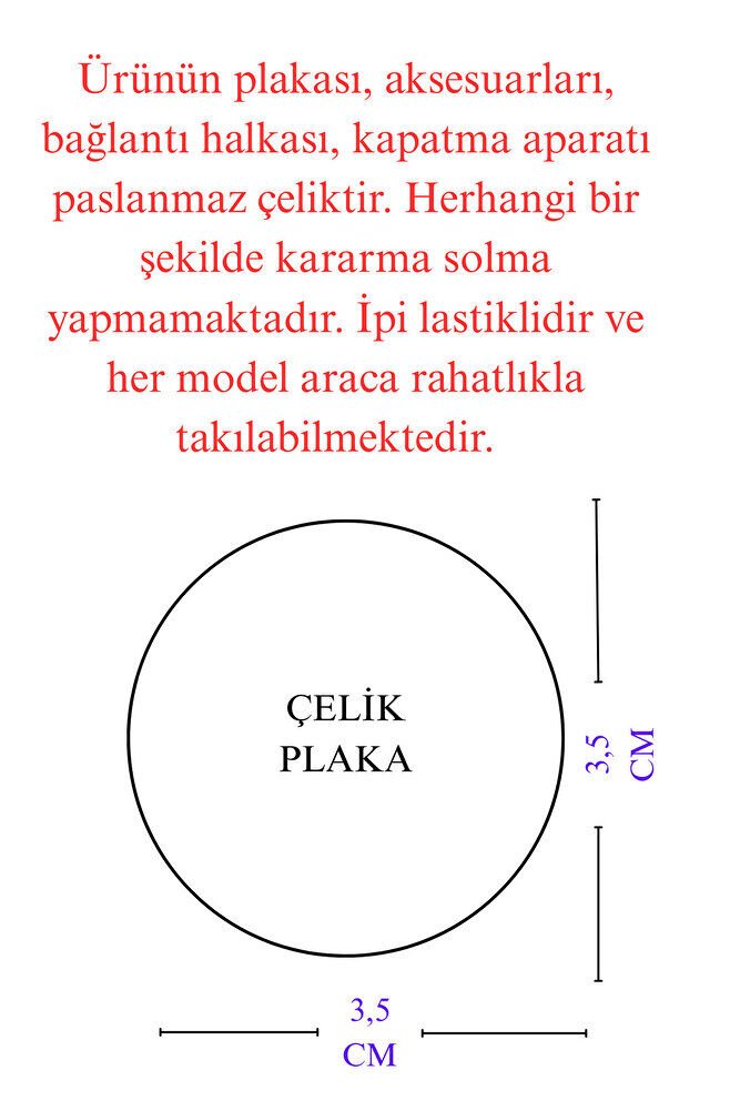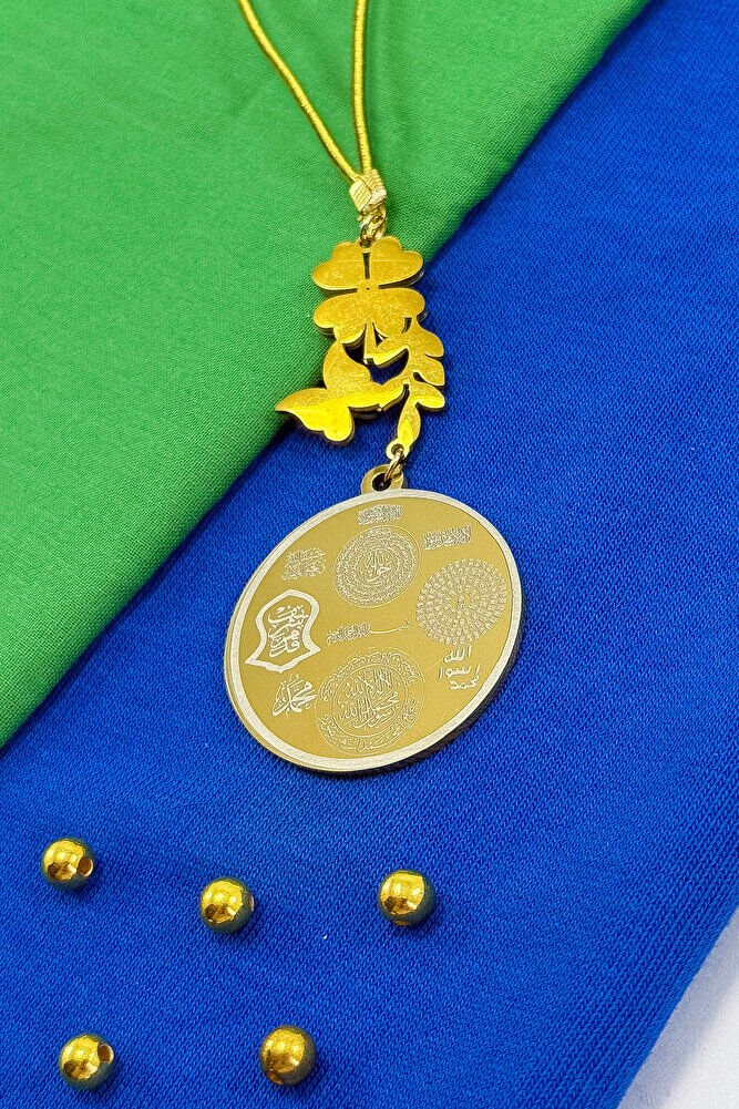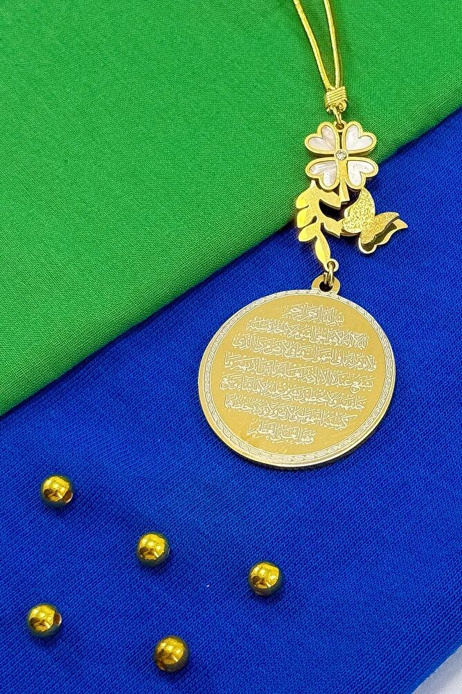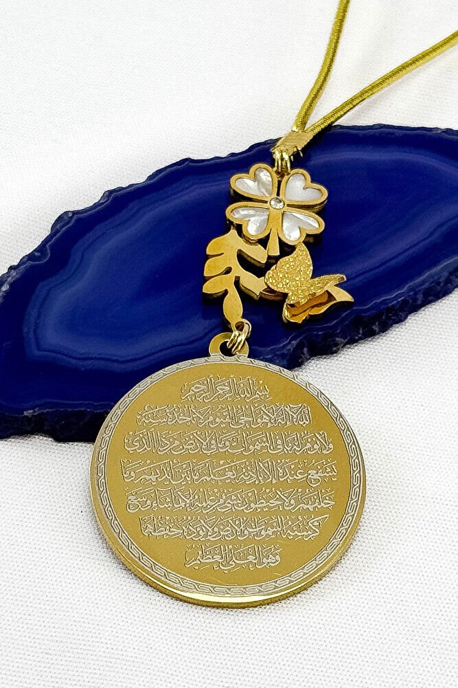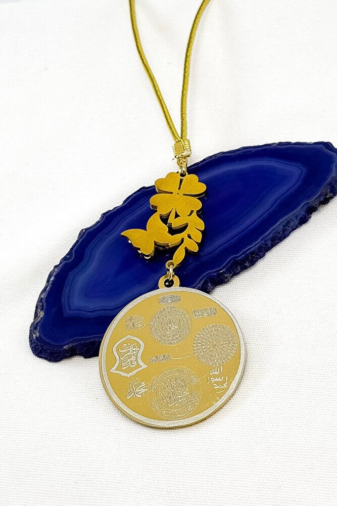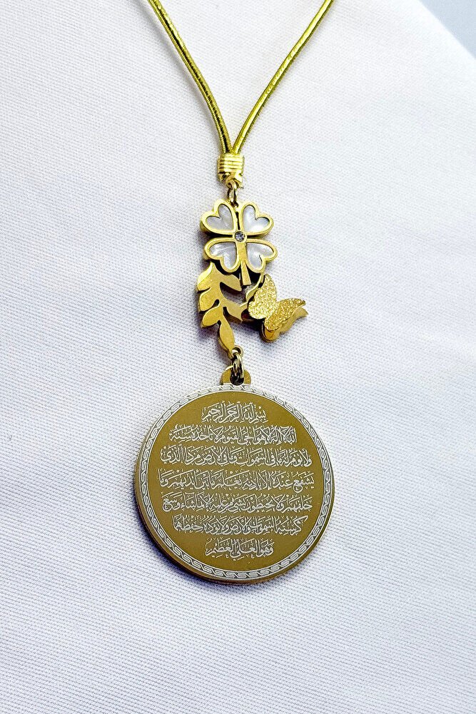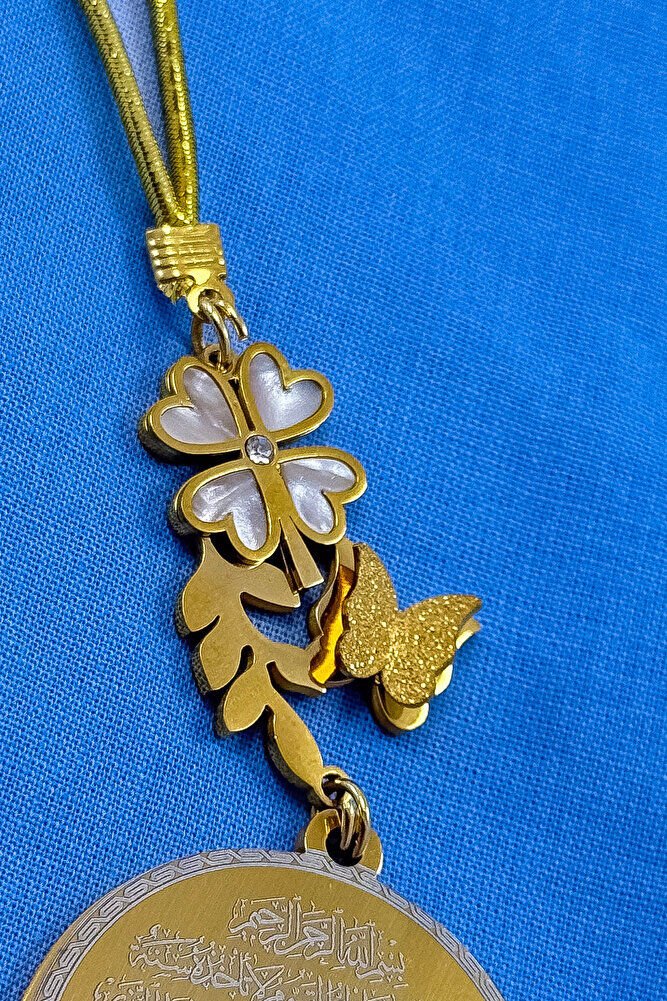 Dualar lazer kazıma tekniği ile kalıcı bir şekilde kazınmaktadır.; Ürün el yapımıdır.; El yapımı olduğu için ufak farklılık ve düzensizlikler olasıdır.; ip elastik olduğu için her modele rahatlıkla takılabilmektedir.; Sedefli papatya ve kelebek detaylı aksesuar paslanmaz çeliktirve tek taraflıdır.; Plaka altın renkli paslanmaz çeliktir.; Ürünün tüm parçaları paslanmaz çeliktir.; Ürün çift taraflıdır, Bir yüzünde Ayetel Kürsi diğer yüzünde Hilye-i Şerif Mührü Şerif Esmaül Hüsna Nallı Şerif Duaları bulunmaktadır.; Altın renkli çelik plaka 3,5 cm ölçülerindedir.; Ayetel Kürsi: Koruyucu ve güçlü bir dua olduğu düşünülür, nazardan ve kötülüklerden muhafaza ettiğine inanılır.; Hilye-i Şerif: Hz.; Muhammed’in fiziksel ve ahlaki özelliklerini anlatan metinlerdir, bereket ve huzur getirdiği söylenir.; Mühr-ü Şerif: Hz.; Muhammed’e ait olduğu rivayet edilen mühürdür, taşıyan kişiye manevi destek sağladığına inanılır.; Esma-ül Hüsna: Allah’ın 99 ismini ifade eder, bu isimleri zikretmenin ruhsal huzur ve duaların kabulüne vesile olabileceği söylenir.; Nalı Şerif: Hz.; Muhammed’in bineğinin nalının bir sembolü olduğu düşünülür, sahibine uğur getirdiğine inanılır.;