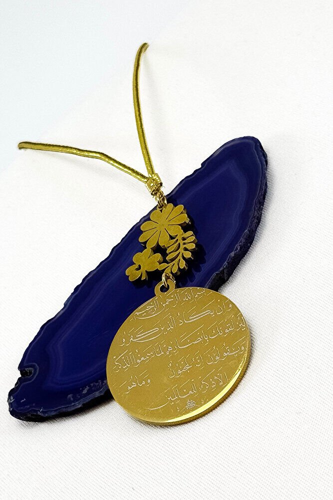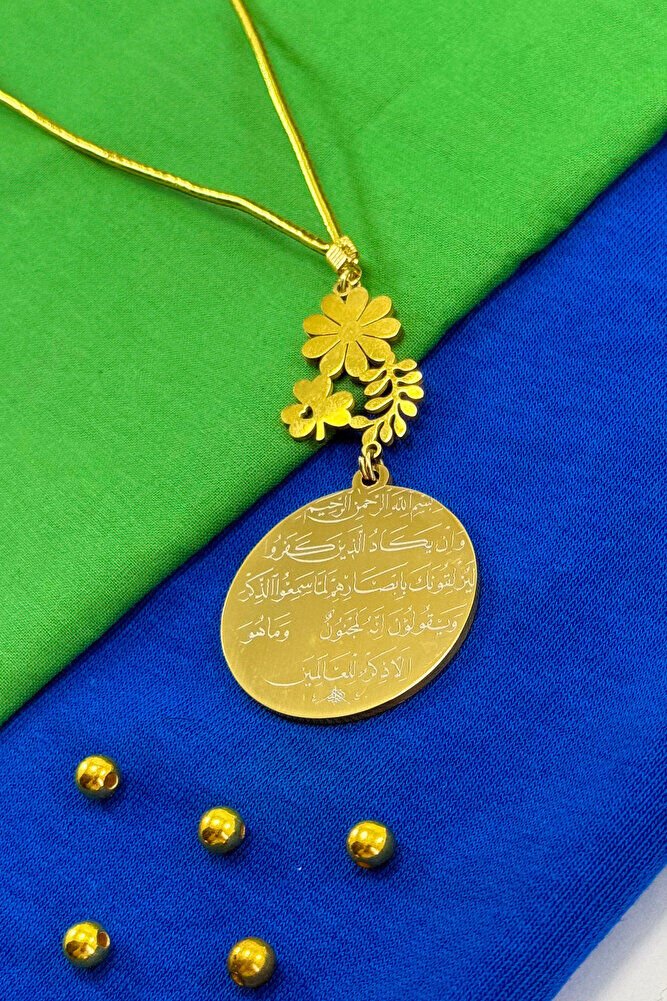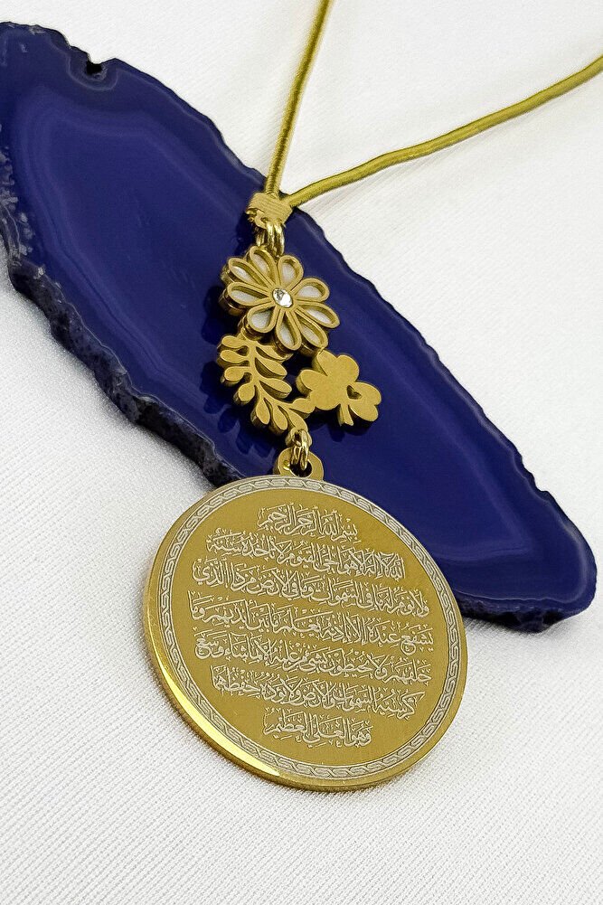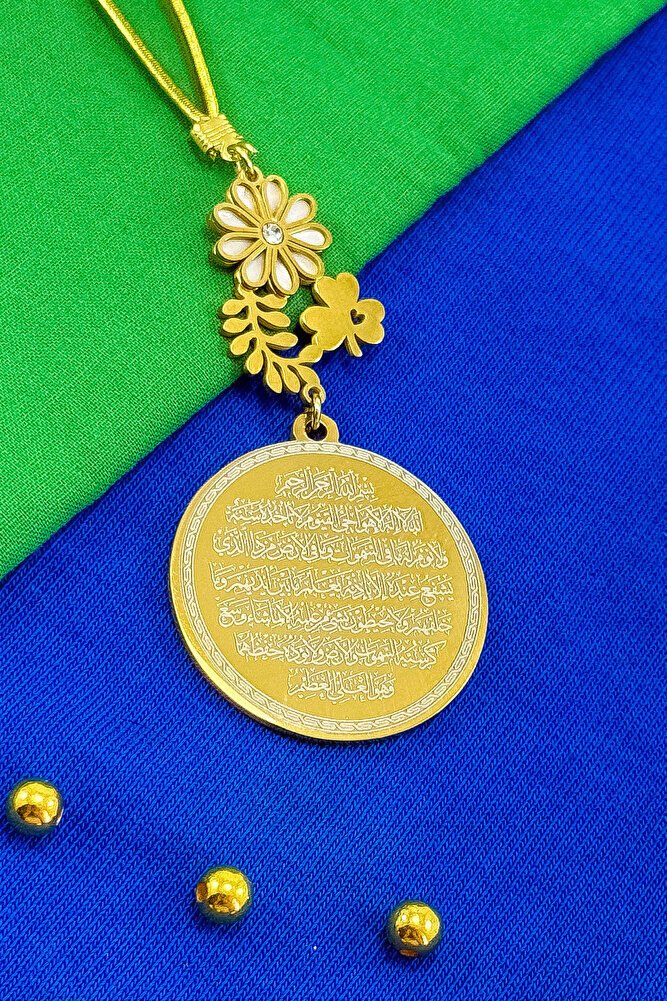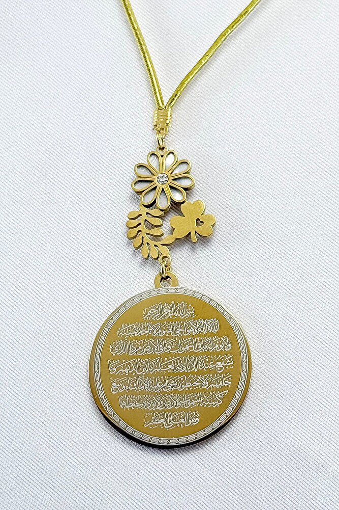 Dualar lazer kazıma tekniği ile kalıcı bir şekilde kazınmaktadır.; Sedefli Yoncalı papatya aksesuarı paslanmaz çeliktir ve tek taraflıdır.; Ayetel Kürsi yazılı yüzünde bulunmaktadır.; Ürün el yapımıdır el yapımı olduğu için ufak farklılık ve düzensizlikler olasıdır.; ip elastiktir.; Elastik olduğu için her modele rahatlıkla takılabilmektedir.; Plaka altın renkli paslanmaz çeliktir.; Ürün üzerinde bulunan bütün metal parçalar paslanmaz çeliktir.; Çelik plaka 3,5 cm ölçülerindedir.; Plaka çift taraflıdır.; Bir yüzünde Ayetel Kürsi diğer yüzünde ise Nazar Ayeti bulunmaktadır.; Nazar ayeti, İslam inancında kötü gözlerden ve olumsuz enerjilerden korunmak amacıyla okunan özel bir duadır.; İnanılır kabul edilir ki, nazar, bir kişinin üzerinde kötü niyetle bakılması sonucu, o kişinin hayatına olumsuz etkiler ve şanssızlık getirebilir.; Nazar ayeti, Allah ın korumasına sığınarak, kişinin bu tür olumsuz etkilerden korunmasını sağlar.; Ayrıca, nazarın kişiye zarar vermemesi için Allah ın kudretine ve ilahi gücüne olan inancı güçlendirir.; Bu dua, zihinsel huzur ve manevi güç sağladığına inanılır, bu nedenle sıkça evlerde, iş yerlerinde veya kişisel eşyalar üzerinde okunur.; Ayetel Kürsi, İslam inancında en güçlü ve koruyucu dualardan biri olarak kabul edilir.; Ayetel Kürsi, Allah ın büyüklüğünü ve egemenliğini ifade eden bir ayet olup, koruma ve manevi güç sağlamak amacıyla sıkça okunur.; Bu ayet, göklerde ve yerin her şeyinin Allah a ait olduğunu vurgular ve şeytani etkilerden korunma sağlar.; Özellikle gece yatmadan önce okunmasının, güvende olma, zararlı enerjilerden korunma ve ruhsal huzur sağlama açısından büyük fayda verdiğine inanılır.; Aynı zamanda, Allah ın her şeyi bildiği ve her şeyin O na bağlı olduğu inancı ile kişiye manevi rahatlık ve güç verir.;