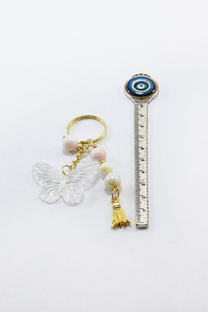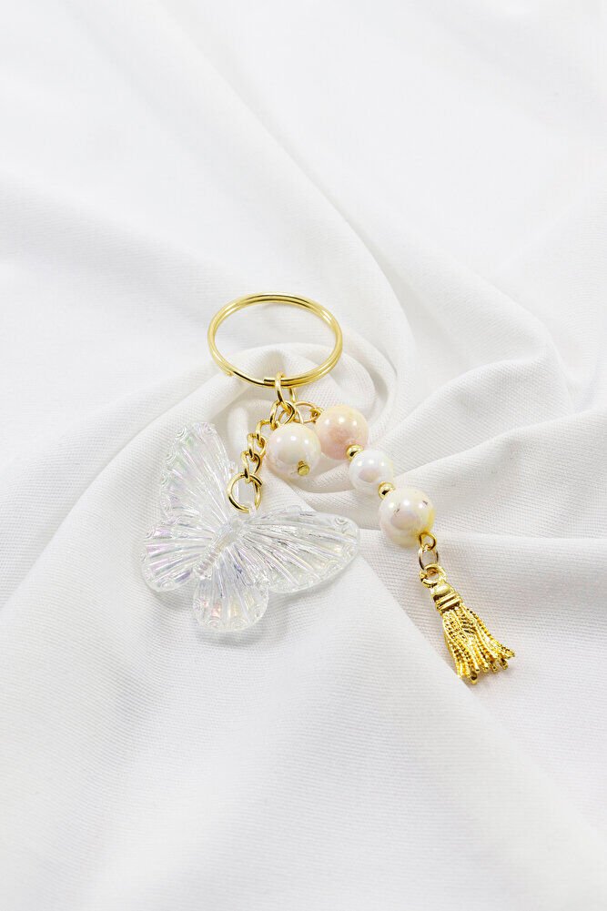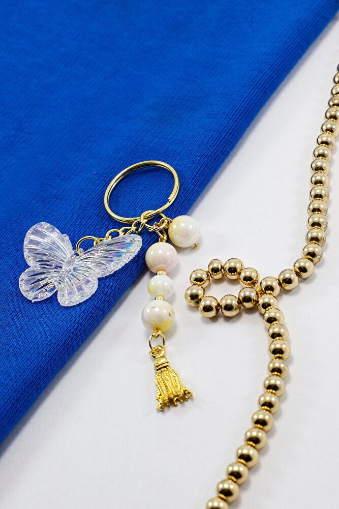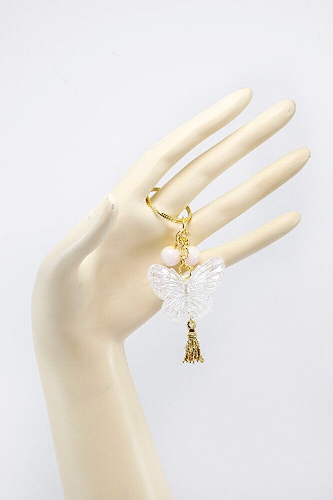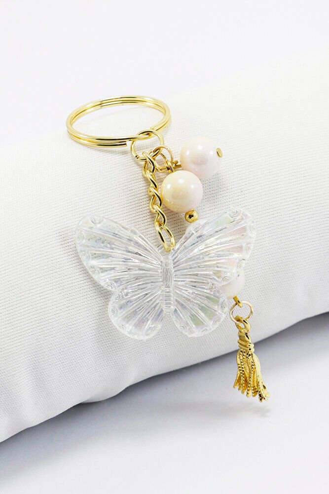 Şeffaf Kelebekli Parlak İncili Metal Püsküllü Küçük Anahtarlık, Hediyelik Şık Çanta Süsü