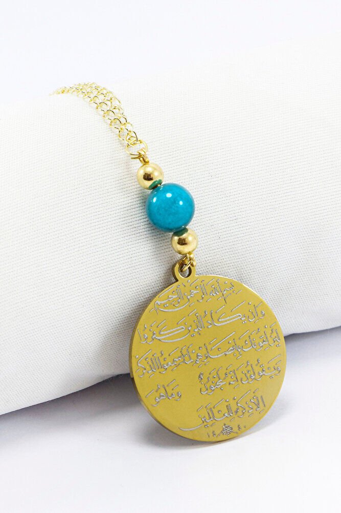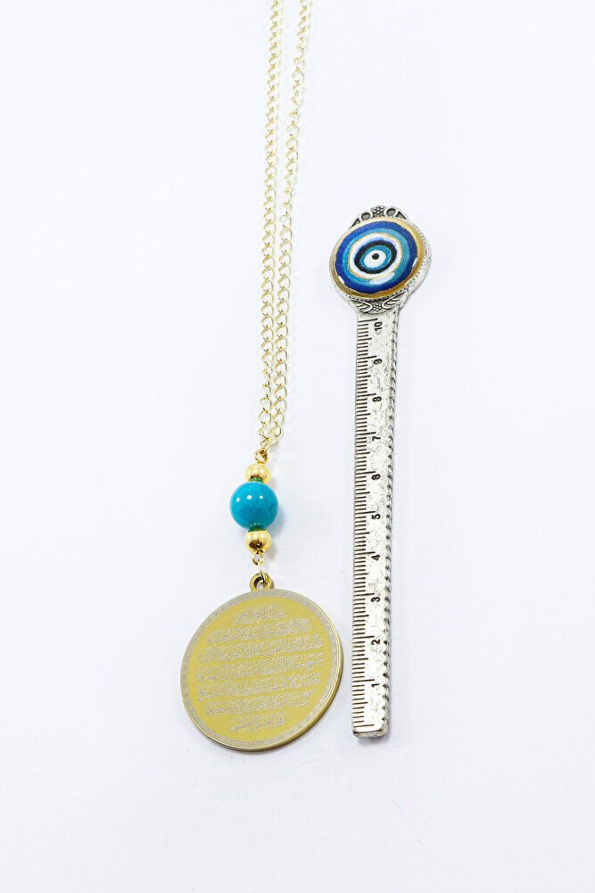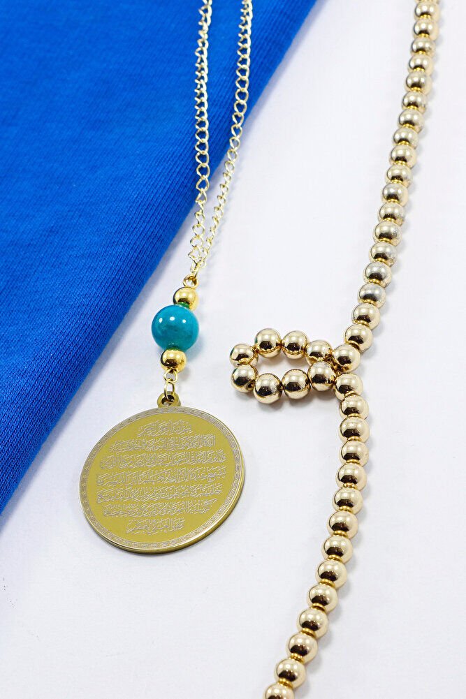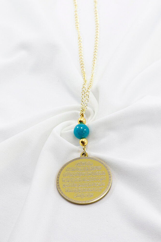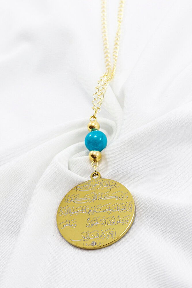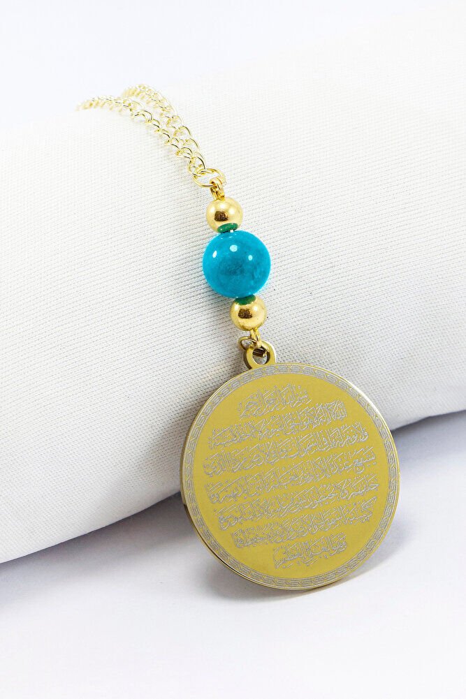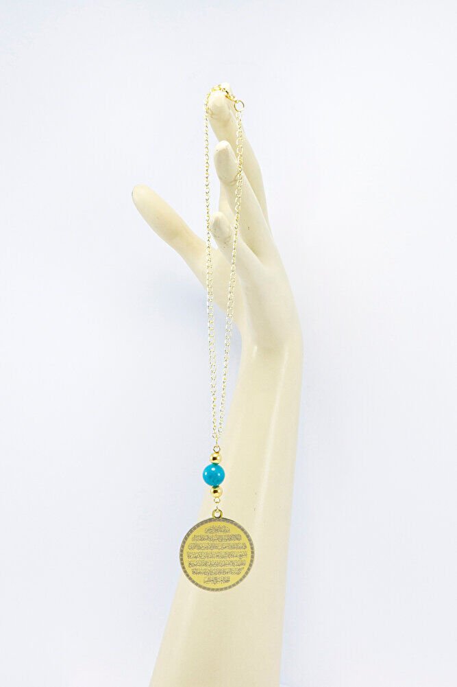 Dualar lazer kazıma tekniği ile kalıcı bir şekilde kazınmaktadır.; Turkuaz boncuk sıkma apatittir.; Ürün el yapımıdır el yapımı olduğu için ufak farklılık ve düzensizlikler olasıdır.; Zincir ayarlanabilir olduğu için her modele rahatlıkla takılabilmektedir.; Plaka gold renkli 316L paslanmaz çeliktir.; Çelik plaka 3,5 cm ölçülerindedir.; Plaka çift taraflıdır.; Bir yüzünde Ayetel Kürsi diğer yüzünde iseNazar ayeti bulunmaktadır.; Ayetel Kürsi, İslam inancında en güçlü ve koruyucu dualardan biri olarak kabul edilir.; Ayetel Kürsi, Allah’ın büyüklüğünü ve egemenliğini ifade eden bir ayet olup, koruma ve manevi güç sağlamak amacıyla sıkça okunur.; Bu ayet, göklerde ve yerin her şeyinin Allah’a ait olduğunu vurgular ve şeytani etkilerden korunma sağlar.; Özellikle gece yatmadan önce okunmasının, güvende olma, zararlı enerjilerden korunma ve ruhsal huzur sağlama açısından büyük fayda verdiğine inanılır.; Aynı zamanda, Allah’ın her şeyi bildiği ve her şeyin O’na bağlı olduğu inancı ile kişiye manevi rahatlık ve güç verir.; Nazar ayeti, Allah’ın korumasına sığınarak, kişinin bu tür olumsuz etkilerden korunmasını sağlar.; Ayrıca, nazarın kişiye zarar vermemesi için Allah’ın kudretine ve ilahi gücüne olan inancı güçlendirir.; Bu dua, zihinsel huzur ve manevi güç sağladığına inanılır, bu nedenle sıkça evlerde, iş yerlerinde veya kişisel eşyalar üzerinde okunur.;
