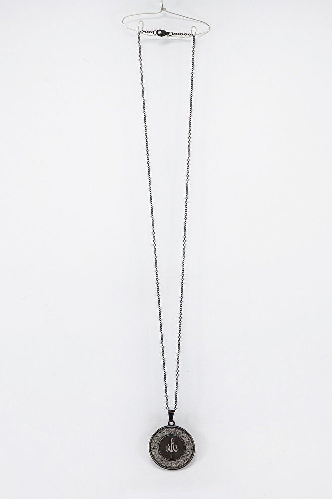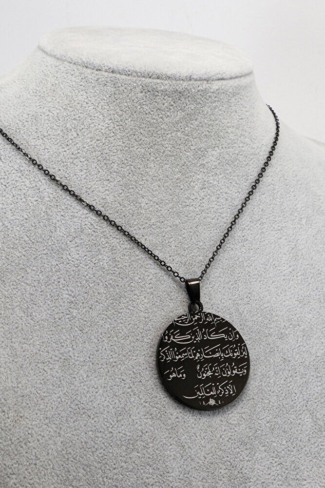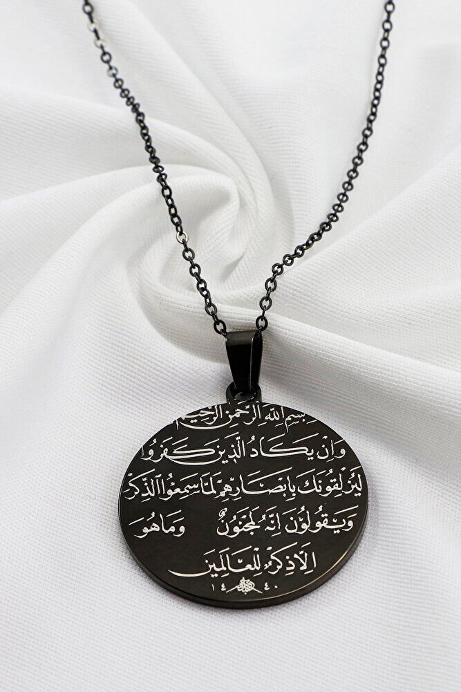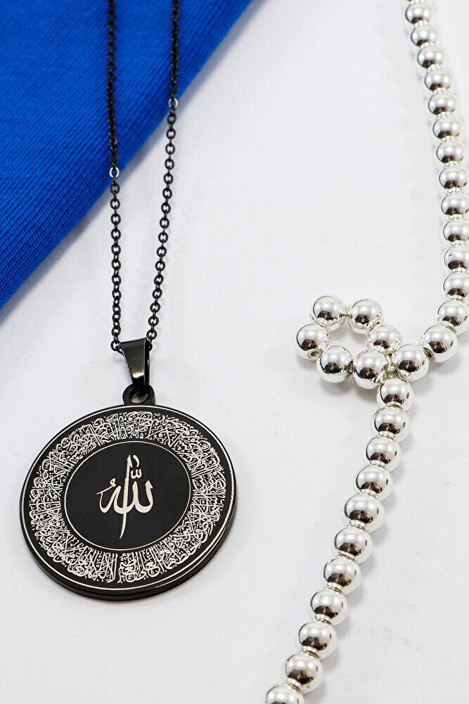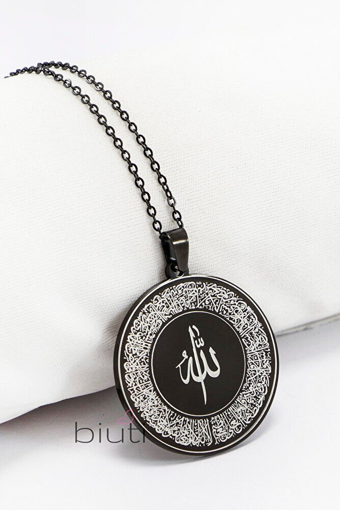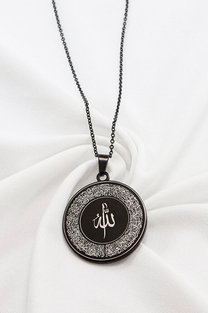 Siyah 316L Çelik Kolye Lazer Kazıma Çift Taraflı Allah Lafzı Ayetel Kürsi Arkada Nazar Ayeti 3,5cm