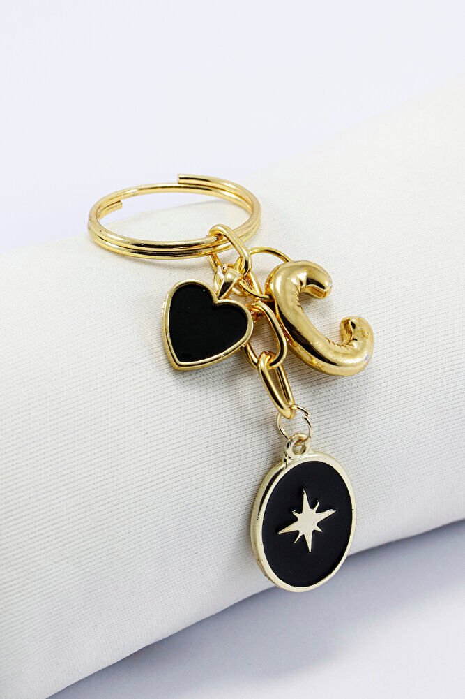 Siyah Cam Nazar Boncuğu Metal Kuzey Yıldızı Küçük Anahtarlık, C Harfi Minik Çanta Süsü EN06575