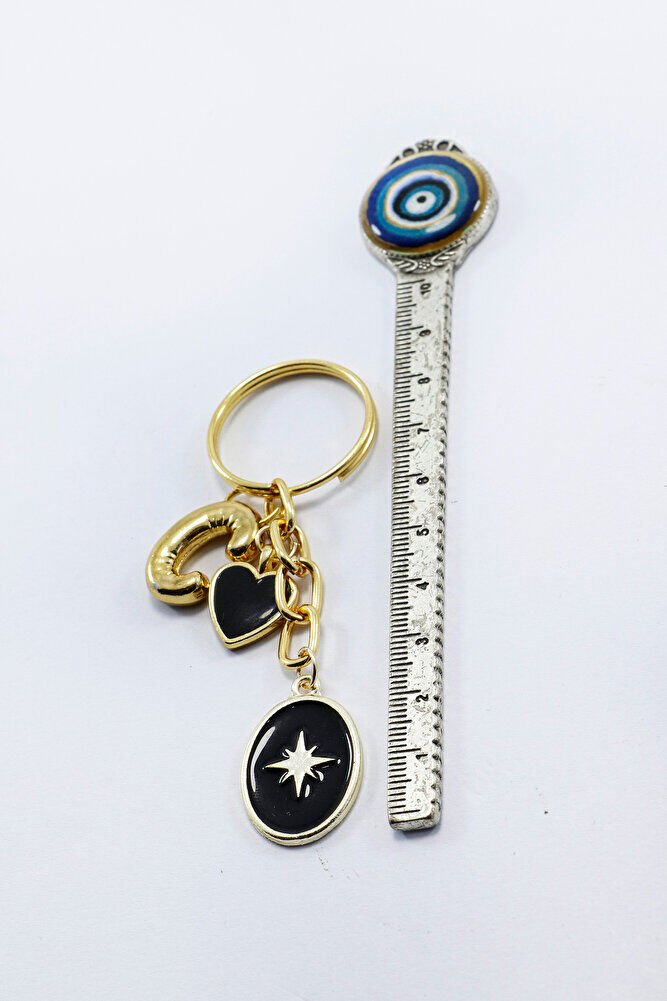 Siyah Cam Nazar Boncuğu Metal Kuzey Yıldızı Küçük Anahtarlık, C Harfi Minik Çanta Süsü