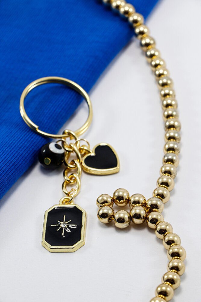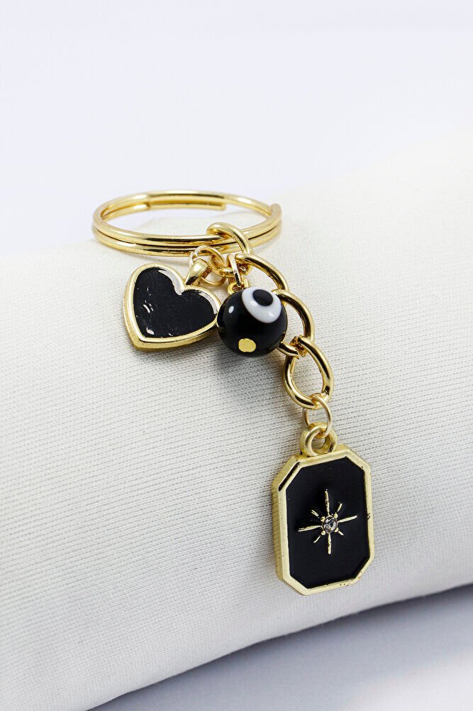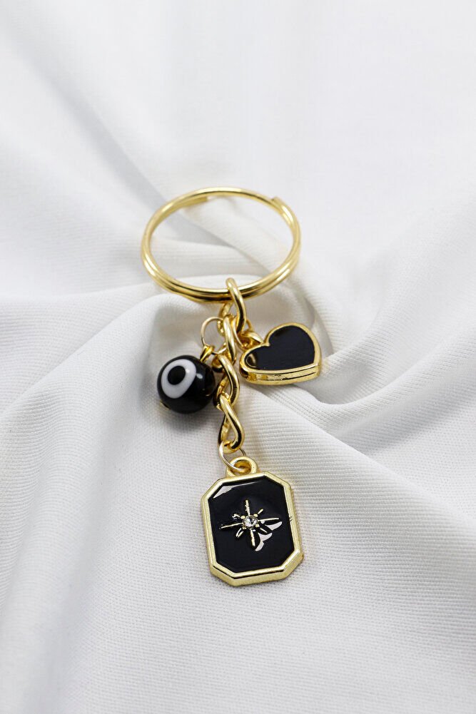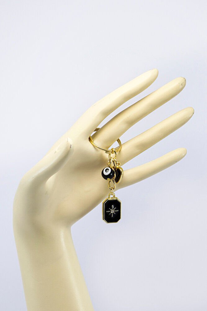 Gold ve siyah tonlardaki metal detaylar ile siyah cam nazar boncuğu kullanılarak tasarlanan bu mini anahtarlık ve çanta süsü, zarif ve modern bir görünüm sunar. Kompakt yapısı sayesinde anahtarlık olarak kullanılabileceği gibi çanta, sırt çantası veya küçük keseler için de şık bir aksesuar olarak tercih edilebilir.