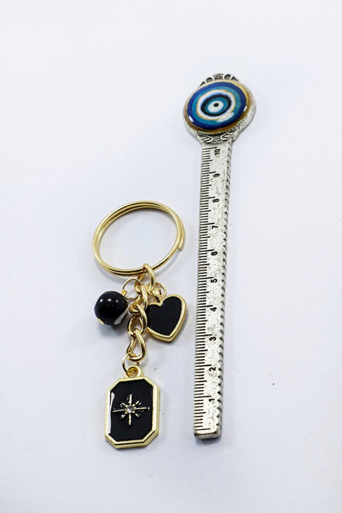 Siyah Cam Nazar Boncuğu Metal Kuzey Yıldızı Küçük Anahtarlık, Minik Çanta Süsü