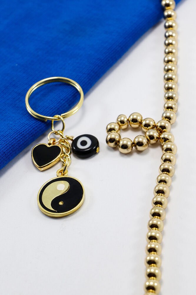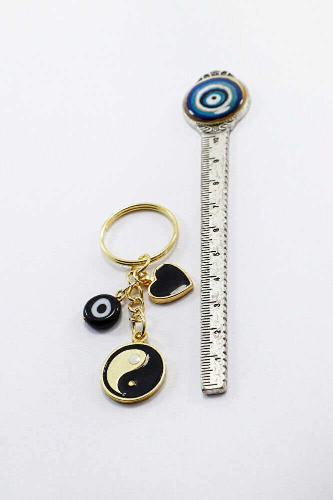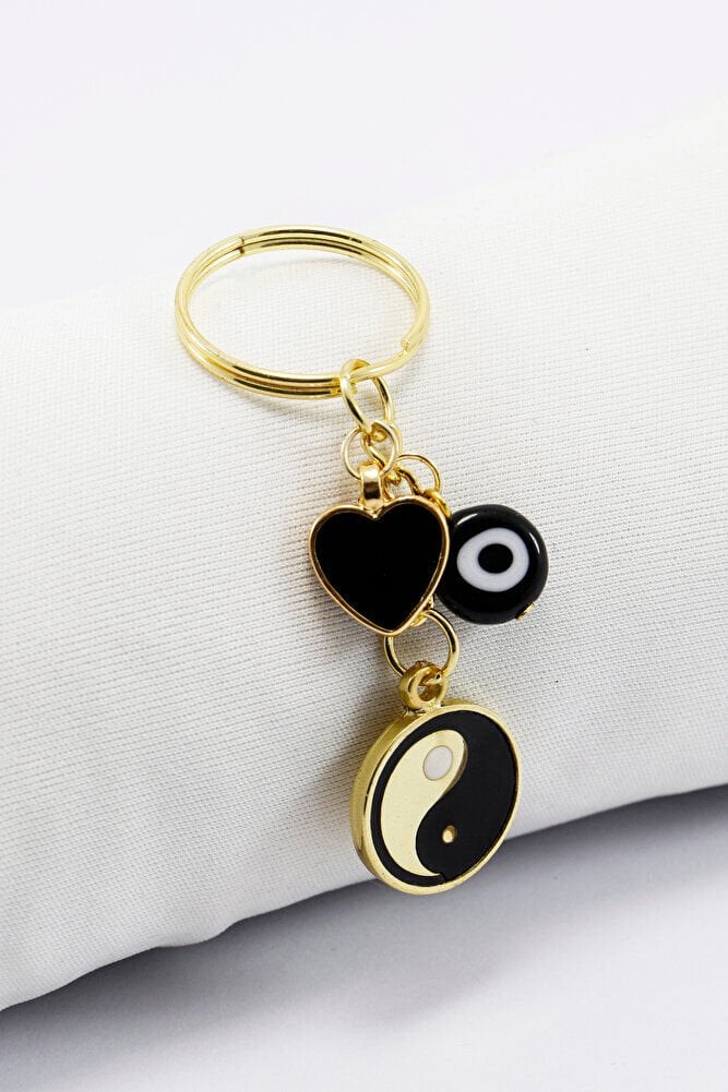 Ürün el yapımıdır.; El yapımı siyah cam nazar boncuğu, metal yin yang sembolü ve siyah kalp detayıyla modern bir görünüm sunar.; Kompakt tasarımı sayesinde çantada, anahtarlıkta veya hediye olarak kullanıma uygundur.; Zarif, anlamlı ve her gün taşınabilir bir aksesuar.;