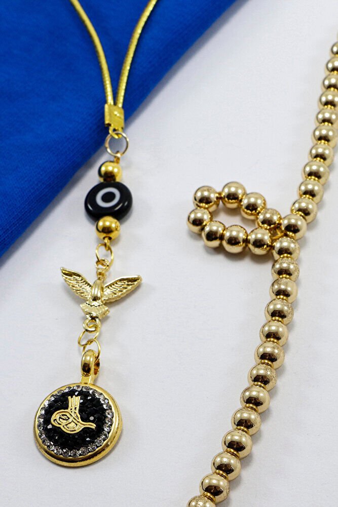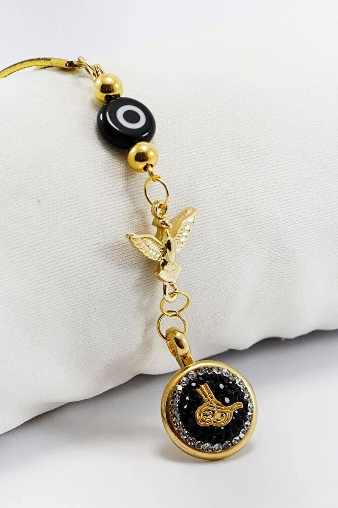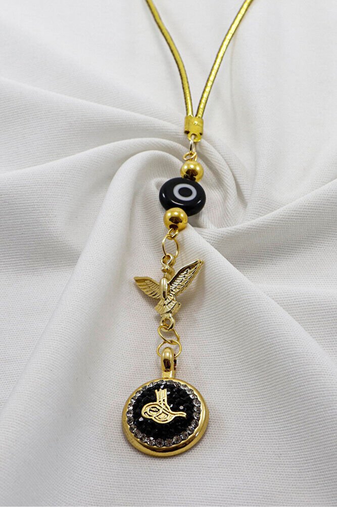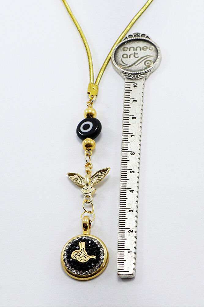 Siyah Cam Yassı Nazar Boncuklu Anka Kuşu Parlak Taşlı Osmanlı Tuğrası Figürlü Araba Dikiz Ayna Süsü