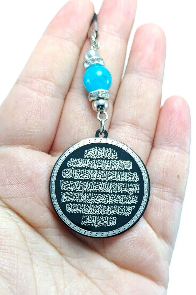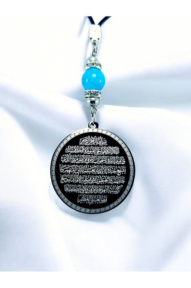 Siyah Çelik Çift Taraflı Ayetel Kürsi Nazar Ayeti Araba Dikiz Ayna Süsü, Turkuaz Doğal Taşlı