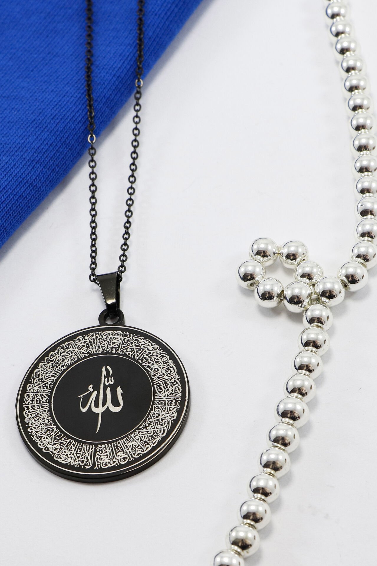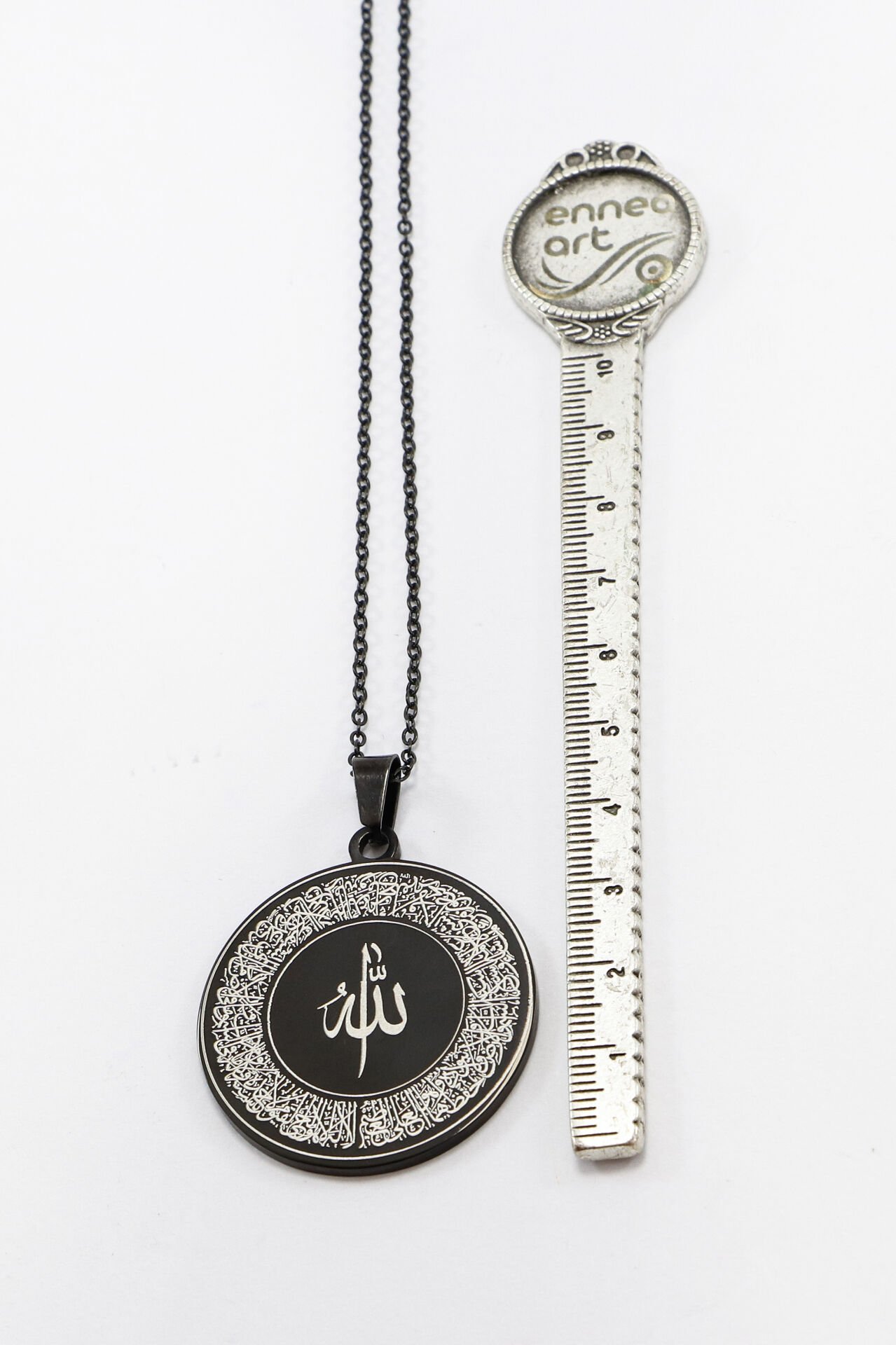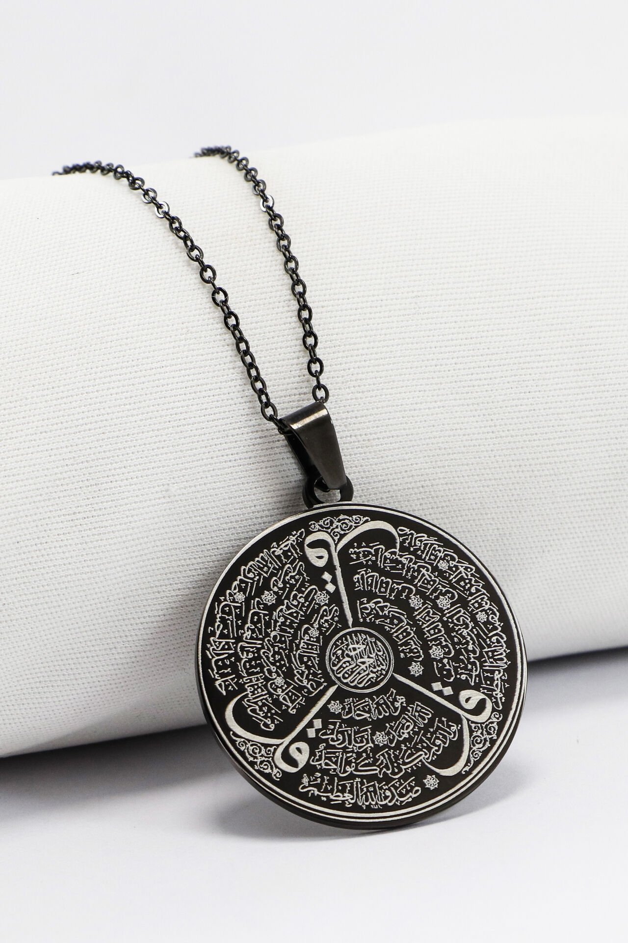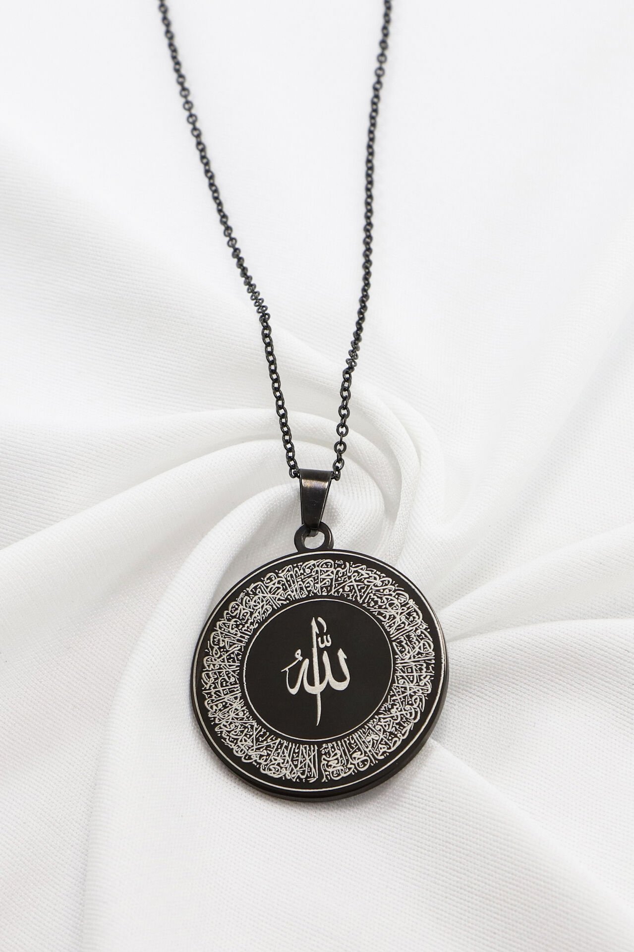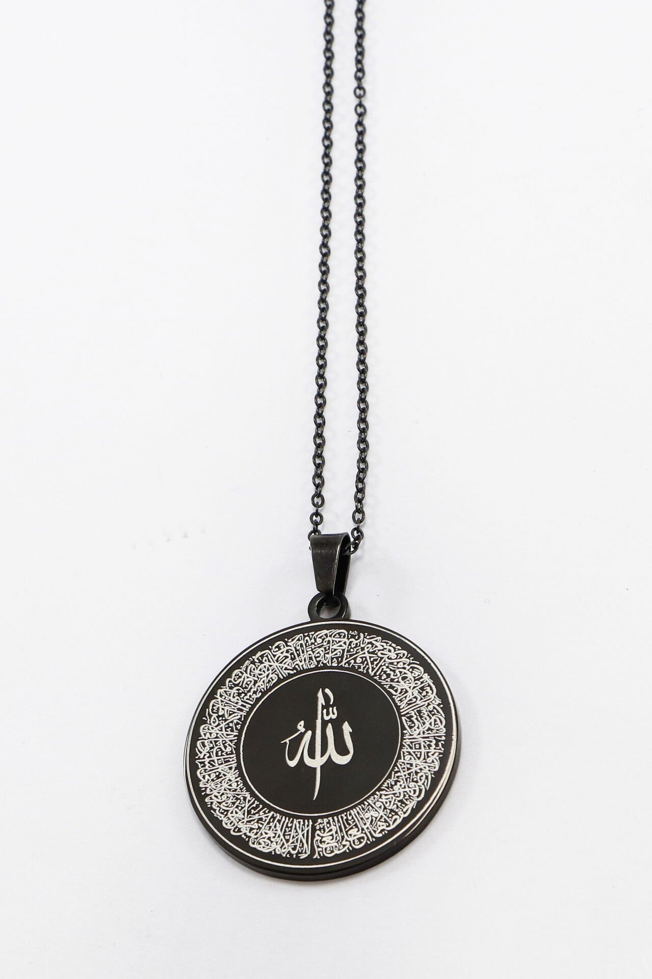 Siyah Çelik Kolye Lazer Kazıma Ön Yüzde Allah Lafzı Ayetel Kürsi Arkada Felak Nas İhlas