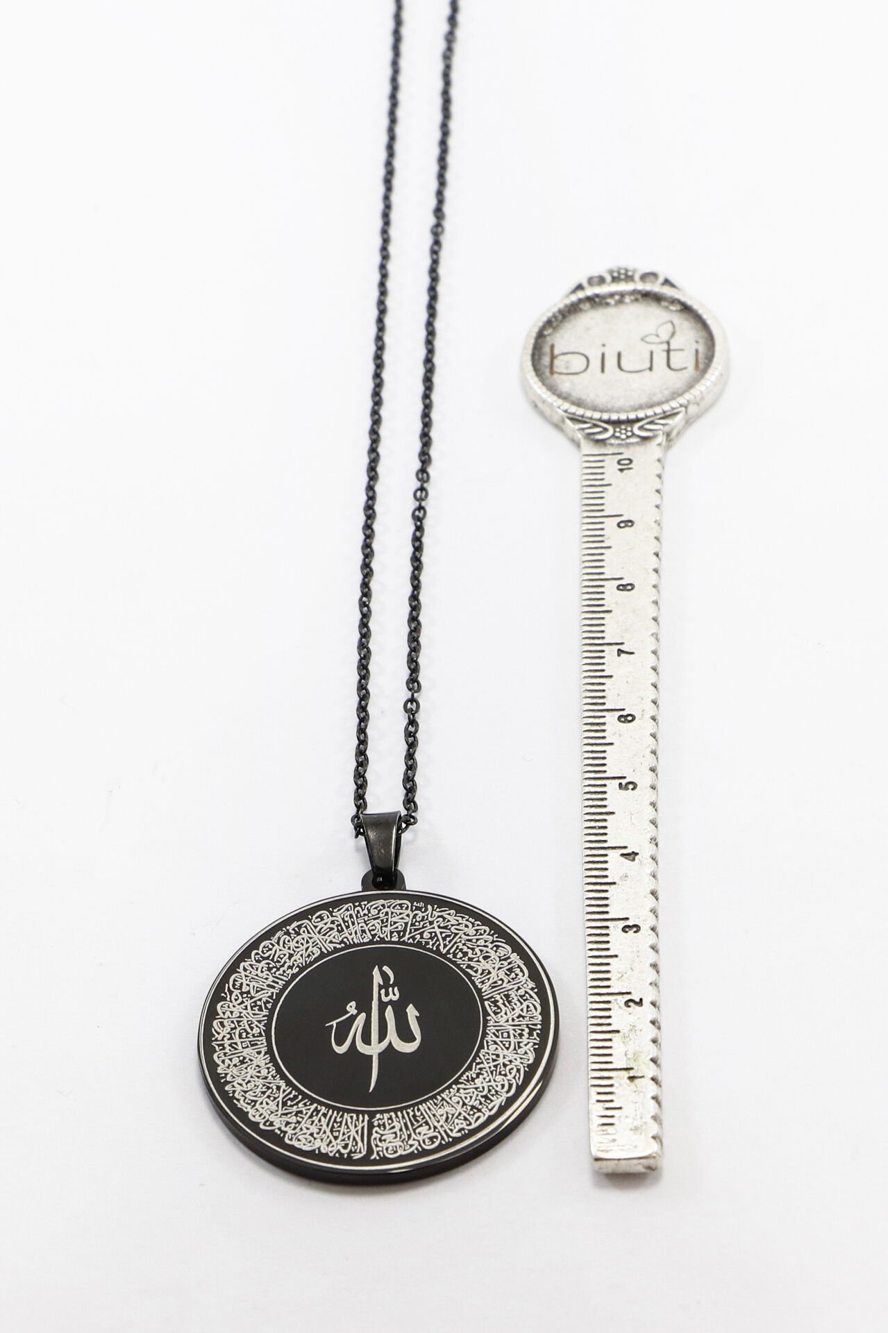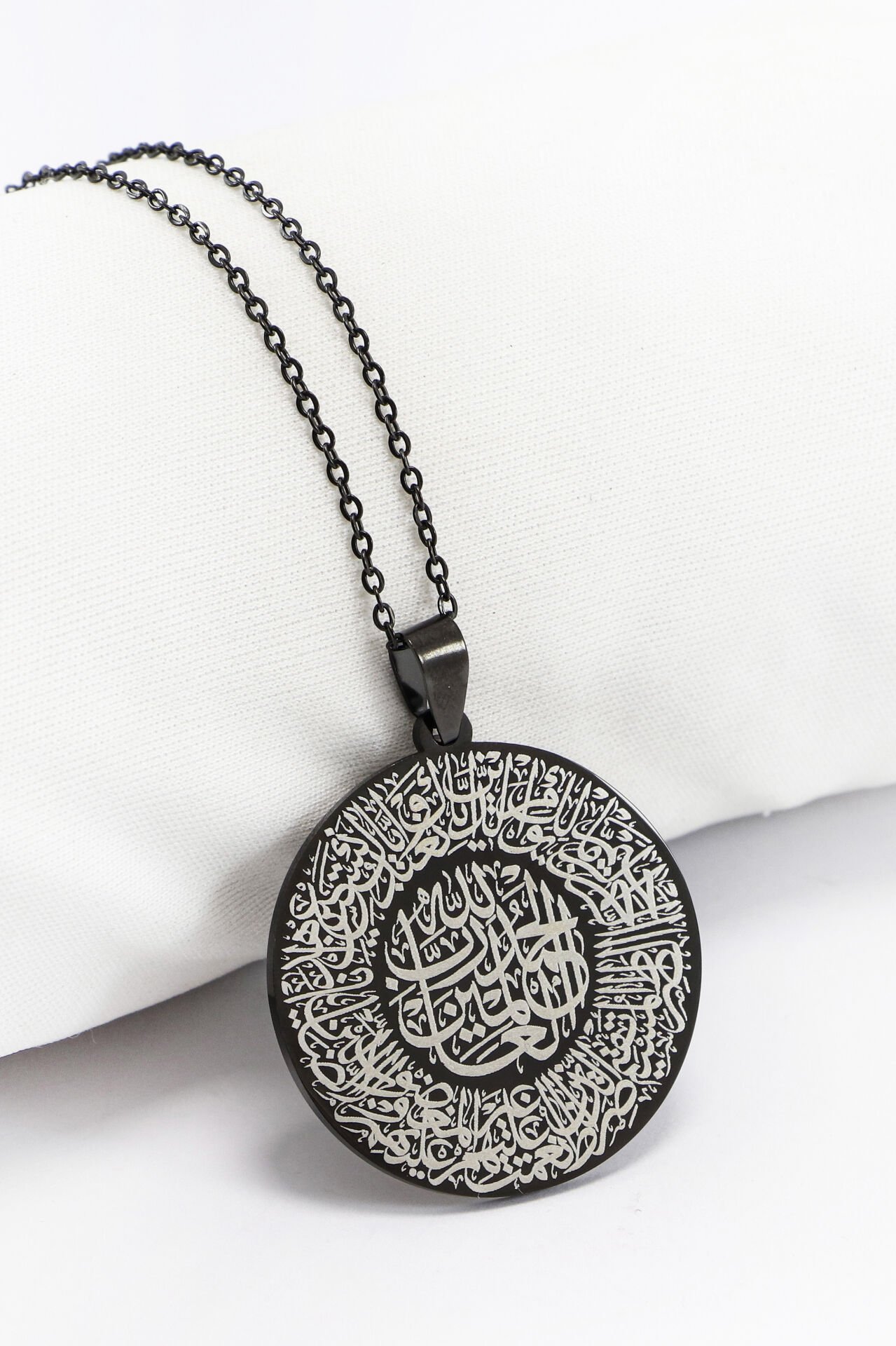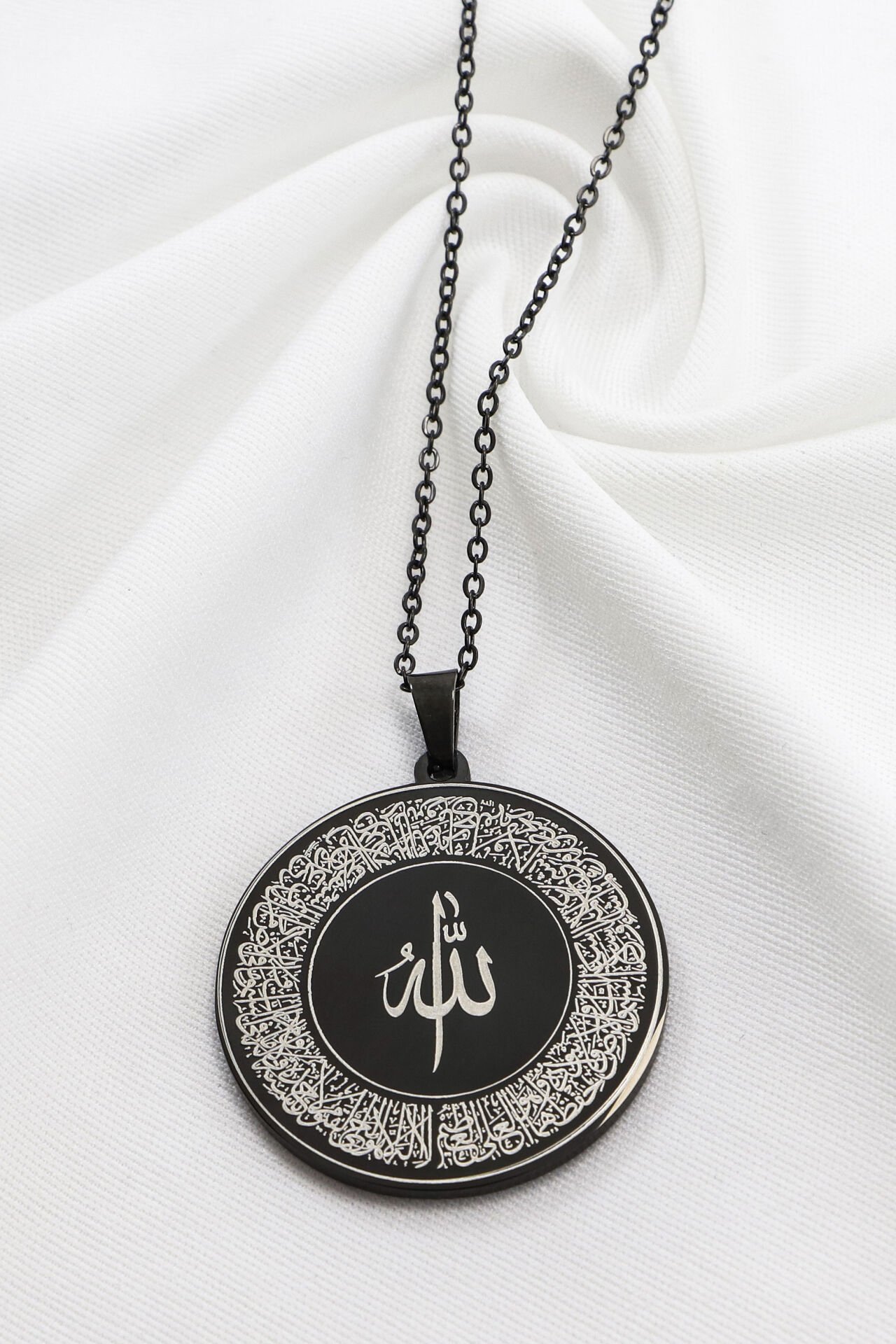 Siyah Çift Taraflı Çelik Kolye, Ön Yüzünde Ayetel Kürsi Arka Yüzünde Hat Fatiha Yazılı Kolye (3 cm)
