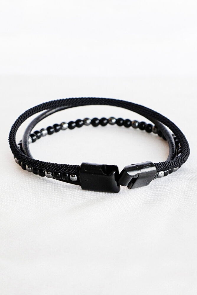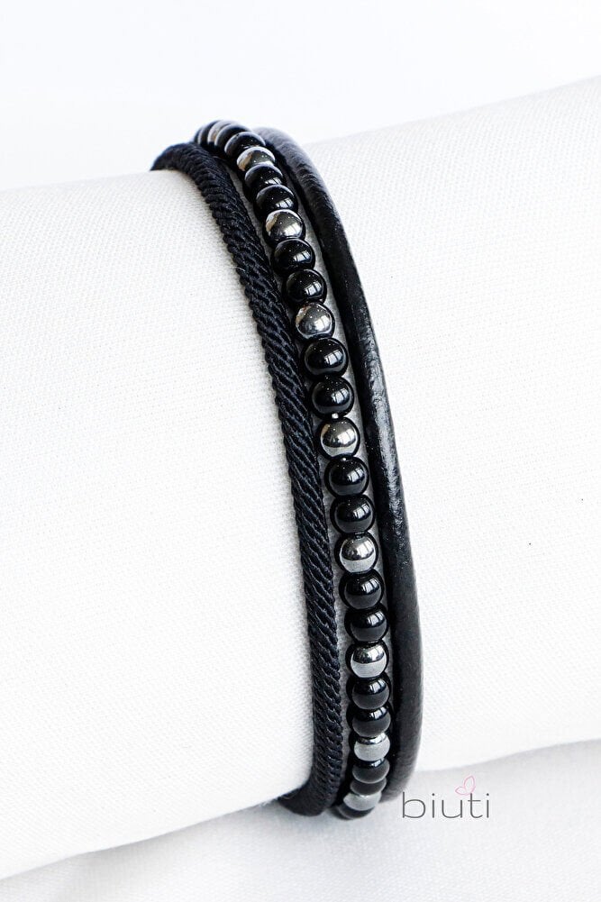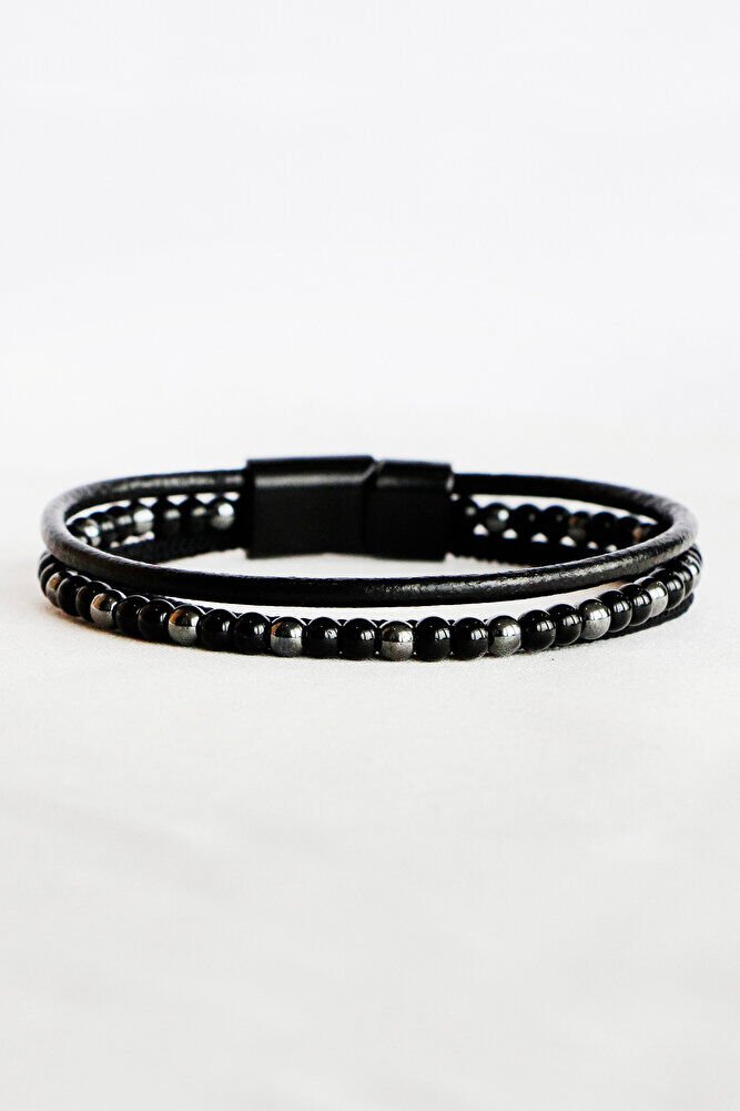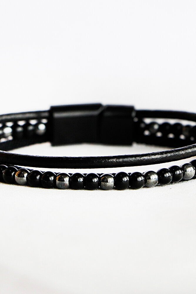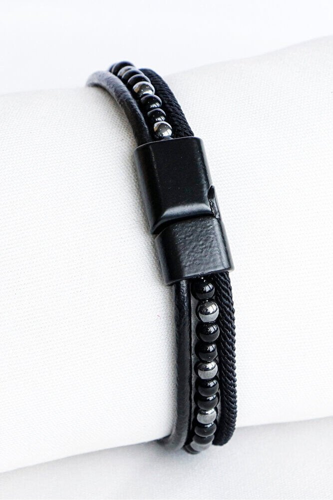 Siyah Hakiki Deri İp Oniks Taşı Üçlü Erkek Bileklik Mıknatıslı, Sevgililer Günü Hediyesi