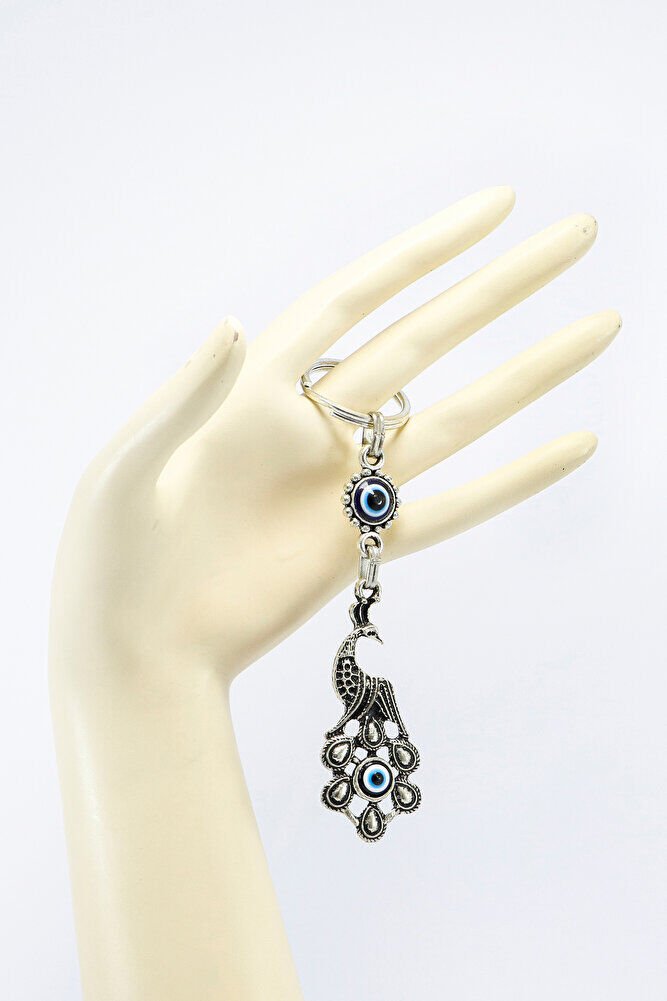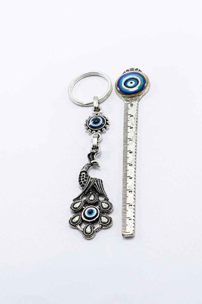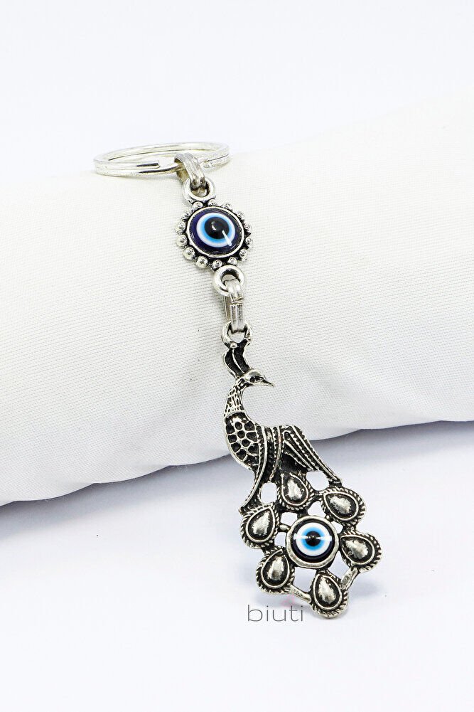 Tavus Kuşu ve Nazar Boncuklu Metal Anahtarlık, Hediyelik Küçük Çanta Süsü