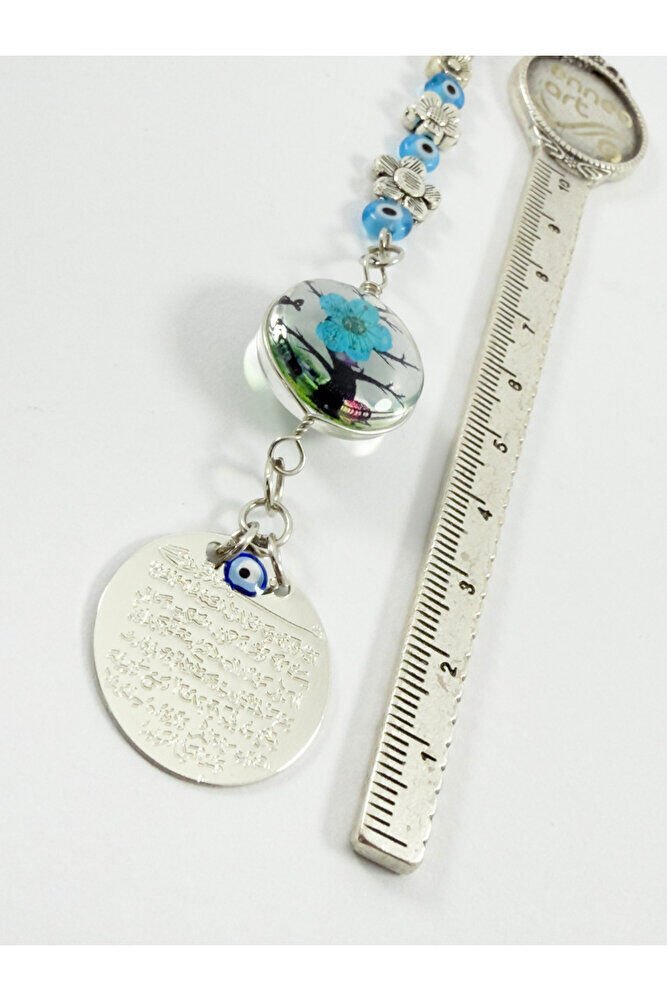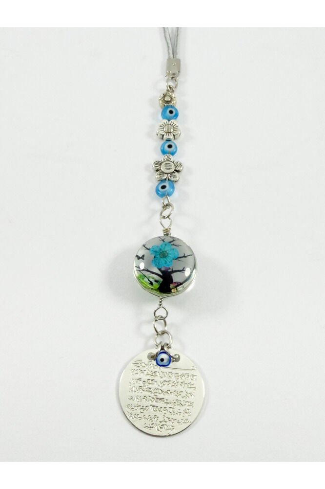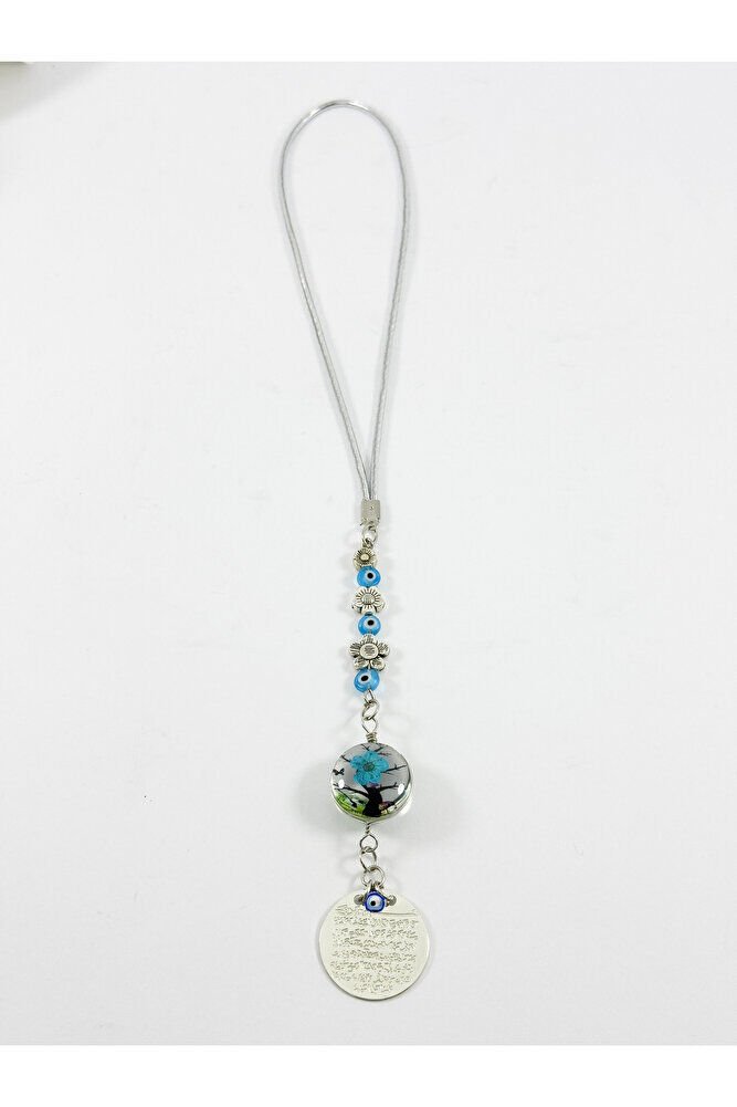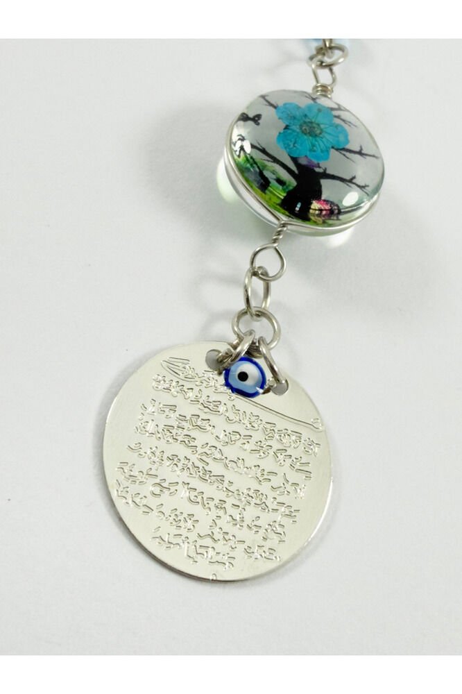 Turkuaz Çiçekli Yaşayan Manzara Metal Ayetel Kürsi Araba Dikiz Ayna Süsü, Cam Nazar Boncuklu