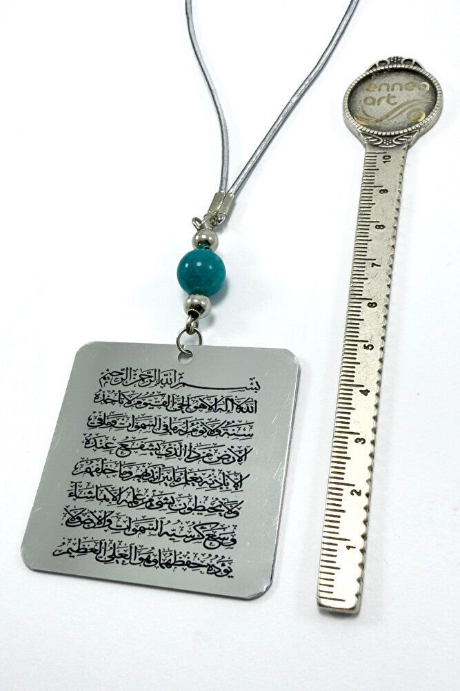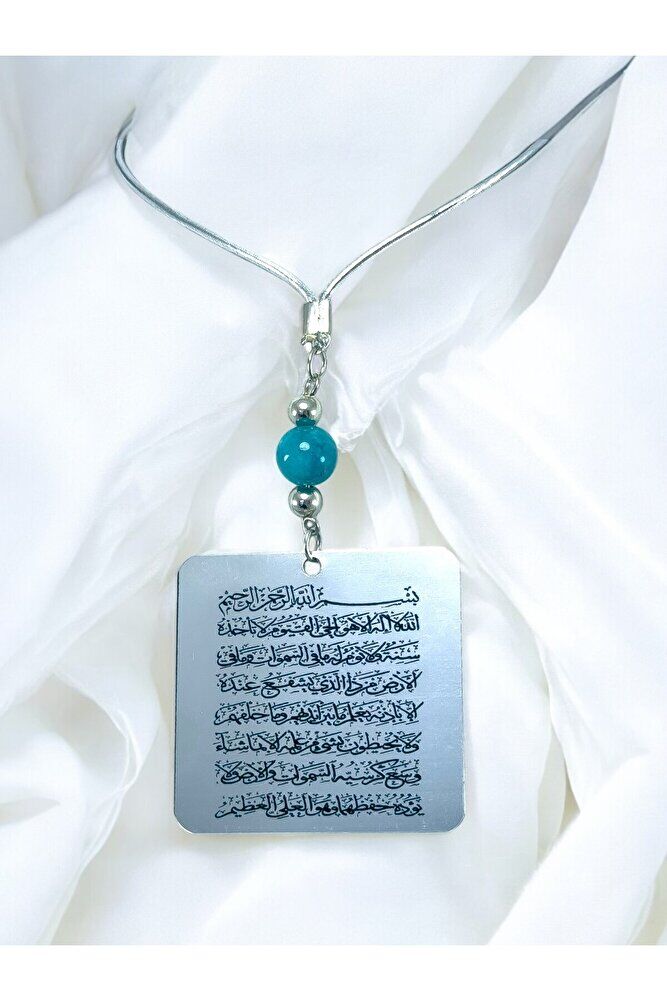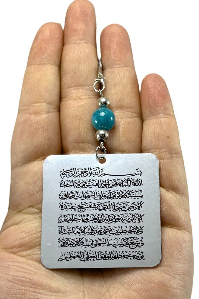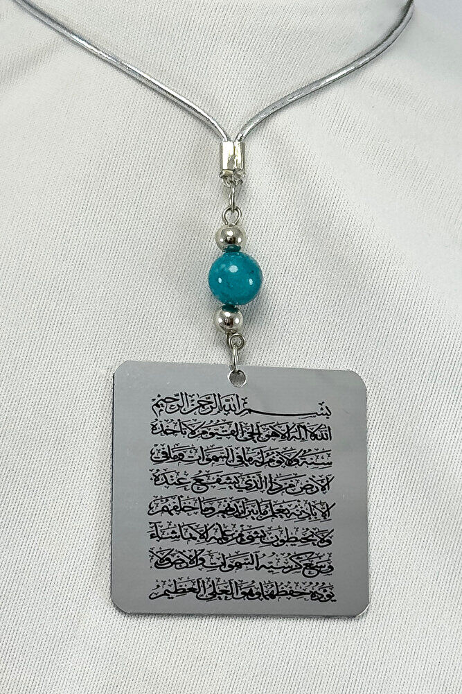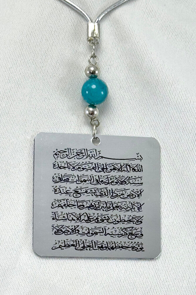 Turkuaz Doğal Taşlı Çift Taraflı Metal Üzerine UV Baskı Ayetel Kürsi Araba Dikiz Ayna Süsü