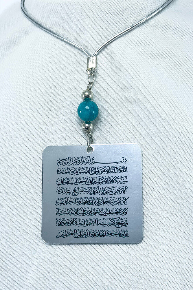 Ürün el yapımıdır.; İpi lastiklidir.; Her modele rahatlıkla takılabilmektedir.; Turkuaz taş doğal taştır.; Plaka metaldir.; Metal Plaka üzerine UV baskıyla çift taraflı olarak Ayetel Kürsi yazmaktadır.;
