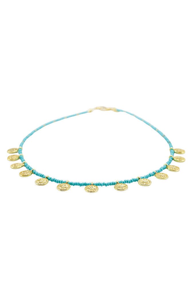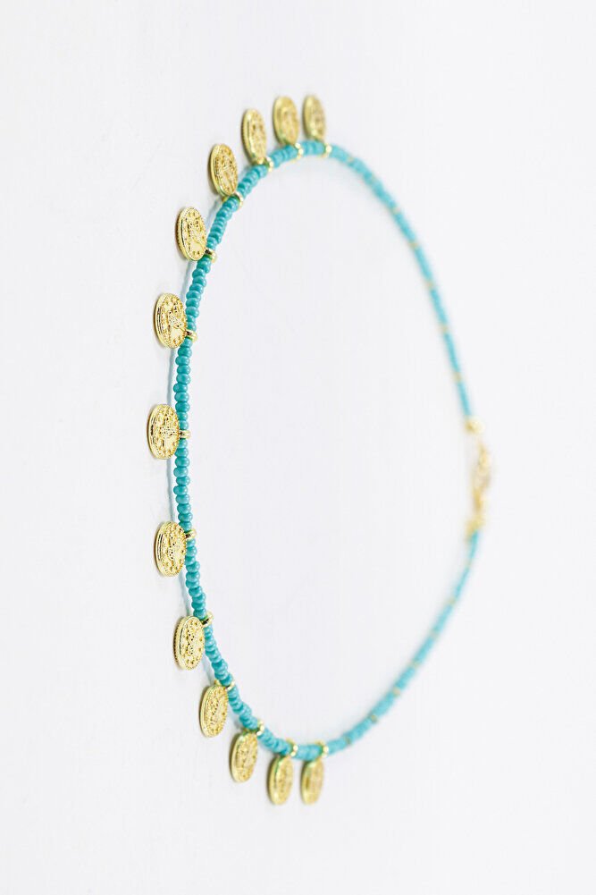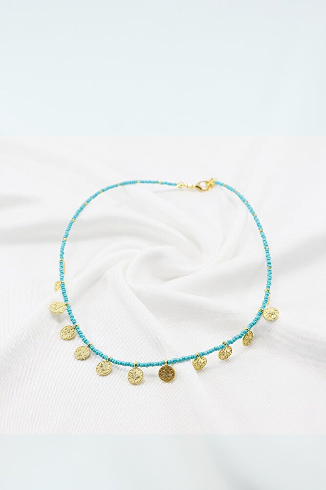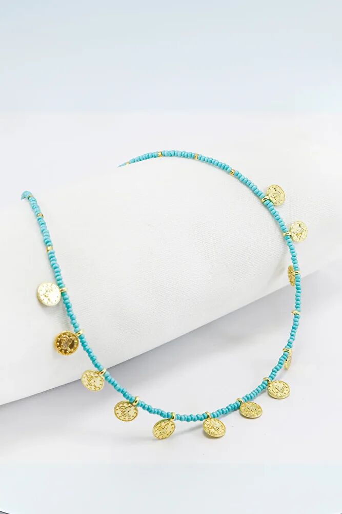Turkuaz Kum Boncuklu Gold Tuğra Figürlü Bijuteri Kolye, Hediyelik Kolye