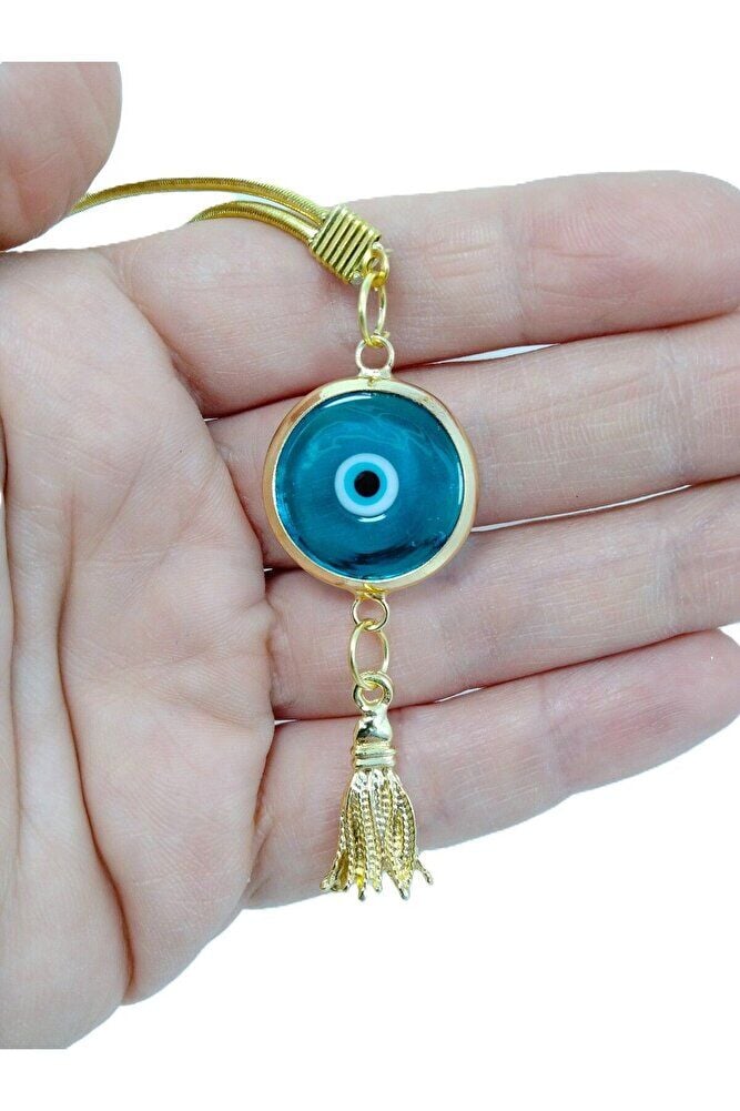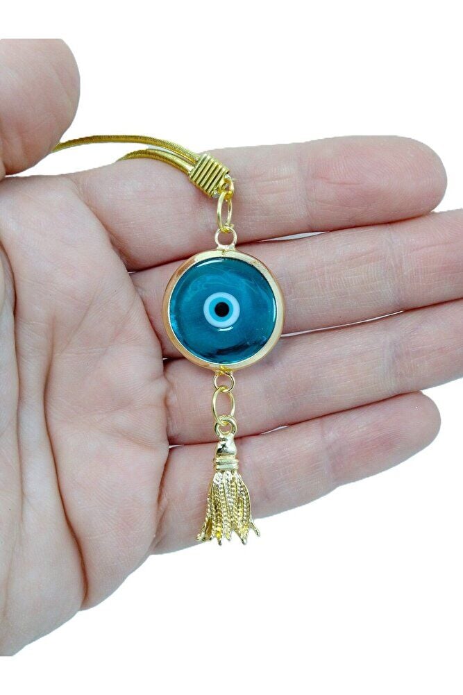 Turkuaz Metal Püsküllü Nazar Boncuğu Lüks Dikiz Ayna Süsü El Yapımı Cam Hediyelik Aksesuar
