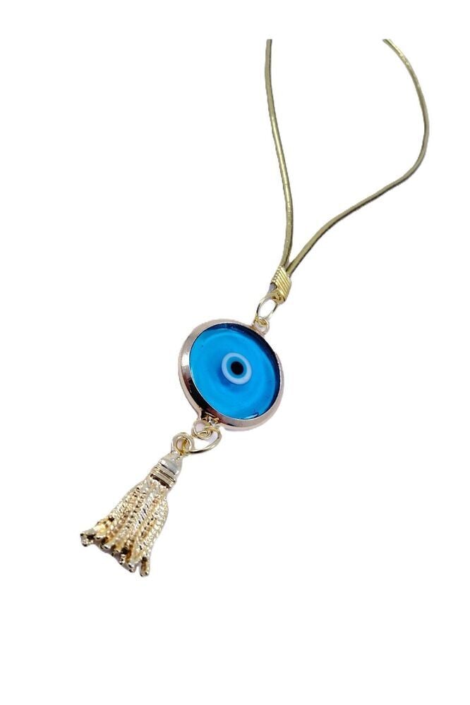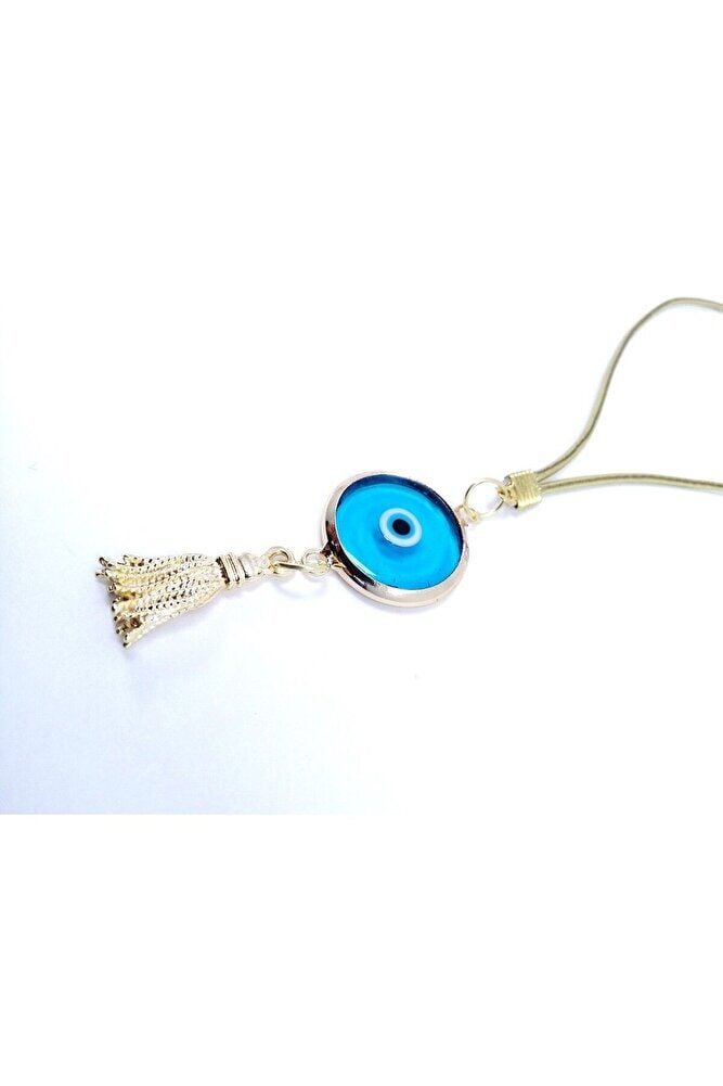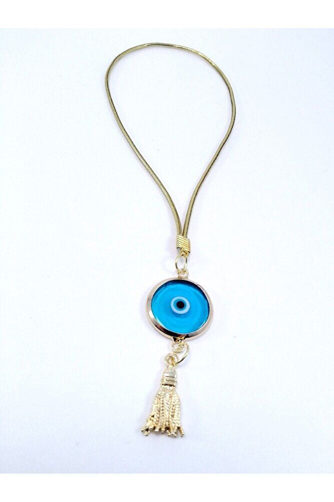 Boncuk el yapımı camdır. ; Püskül metaldir. ; Gold renkli metalik ip elastiktir. ; El yapımı olduğu için ufak farklılık ve düzensizlikler olasıdır. ; Nazar boncuğu, Türk kültüründe ve diğer bazı Orta Doğu ülkelerinde kullanılan bir tür koruyucu nesnedir. ; Genellikle mavi ve beyaz renklerde tasarlanan küçük bir boncuktur ve içinde siyah bir nokta veya göz şekli bulunur.Nazar boncuğunun amacı, kişinin üzerindeki kötü şansı, kıskançlığı veya nazarı (bakışları) uzaklaştırmak ve korumak için kullanılır. ; Bu nedenle, evlerde, arabalarda, iş yerlerinde, takılarda ve hatta bebeklerin kıyafetlerinde kullanılabilir.;