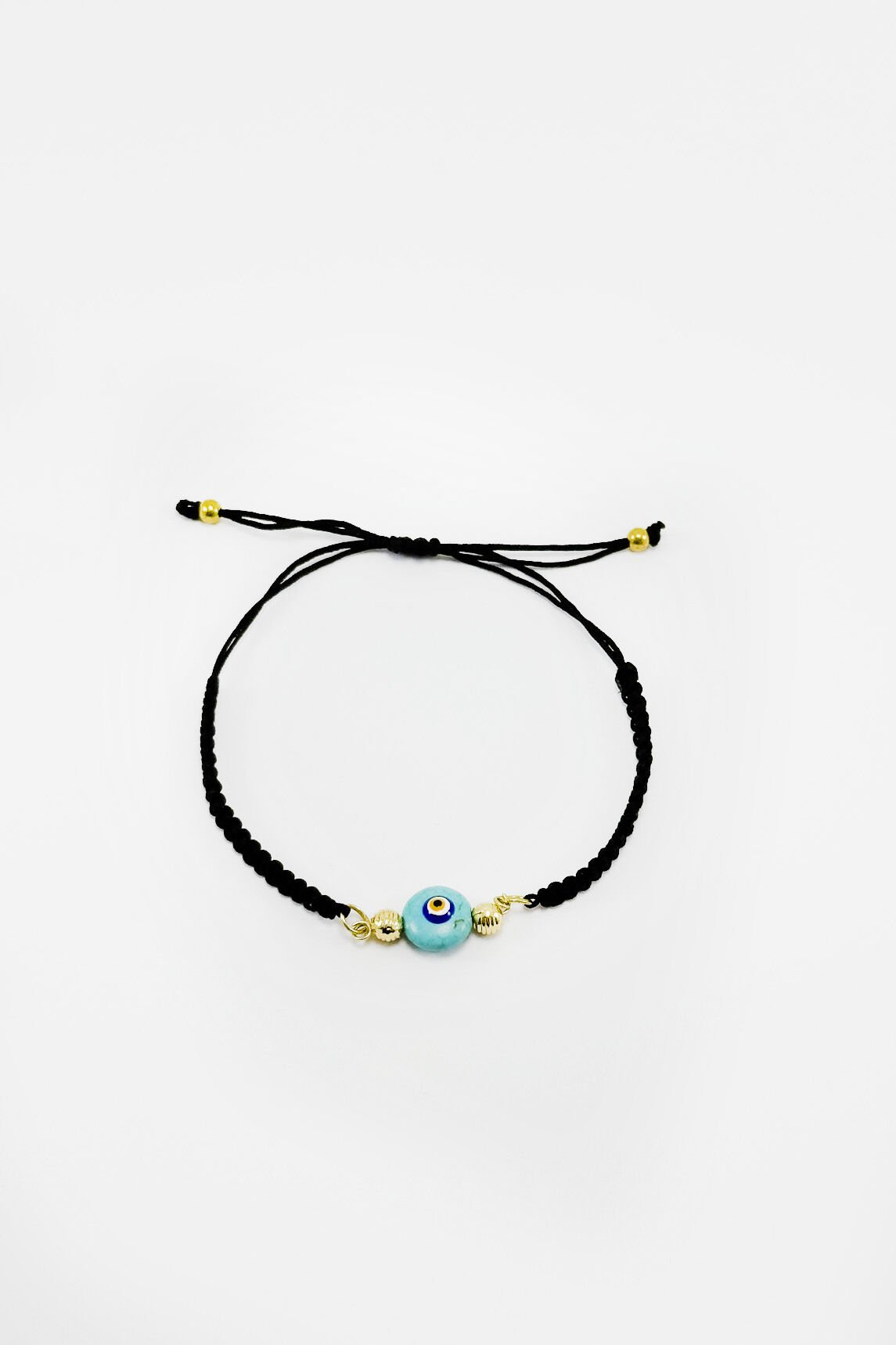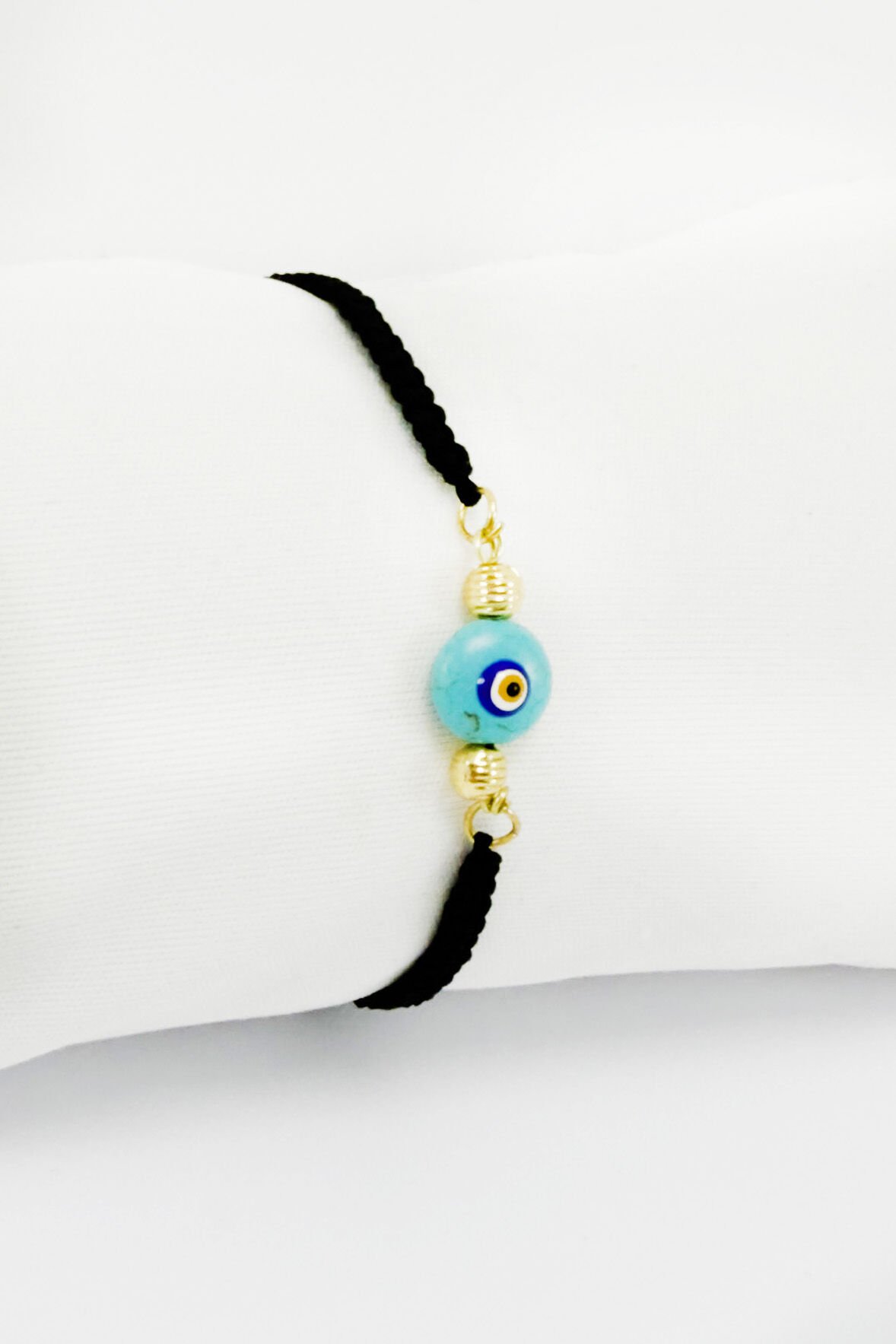 Turkuaz nazar boncuğuyla tasarlanmış siyah ipli asansörlü ayarlanabilir bileklik, zarif ve anlam yüklü bir aksesuardır.