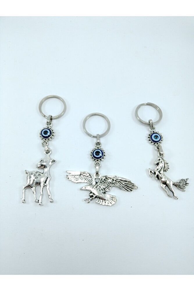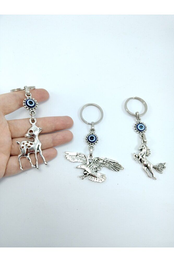Üçlü Metal Nazar Boncuklu Anahtarlık Seti Geyik Kartal At Temalı Hediyelik Eşya