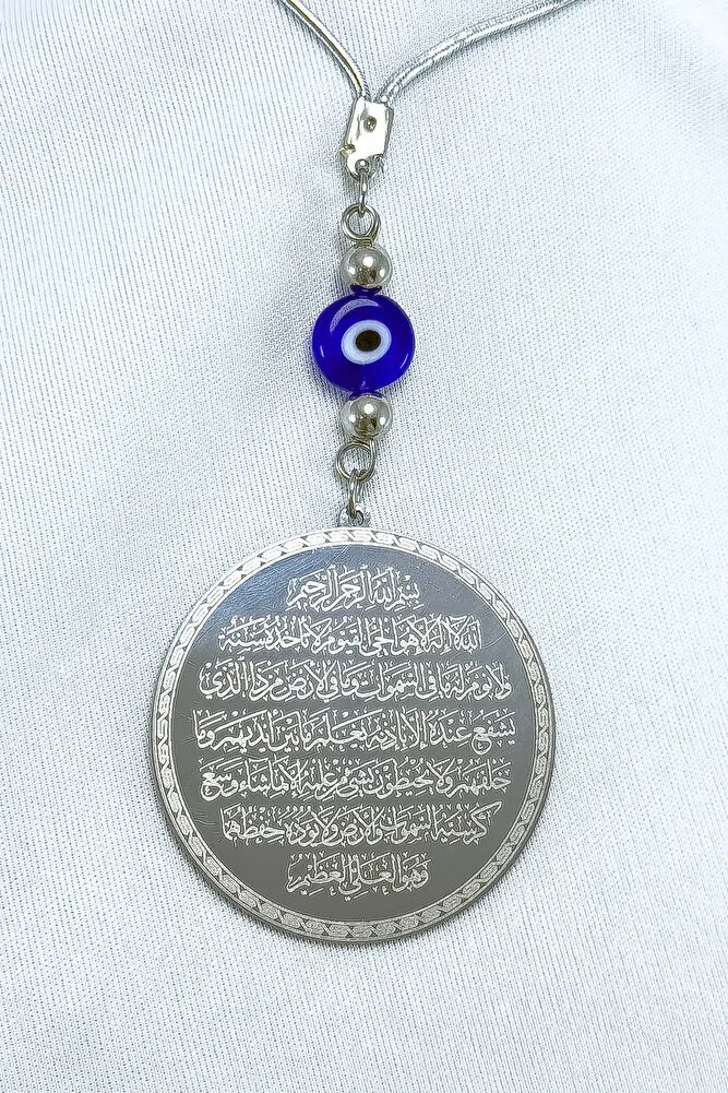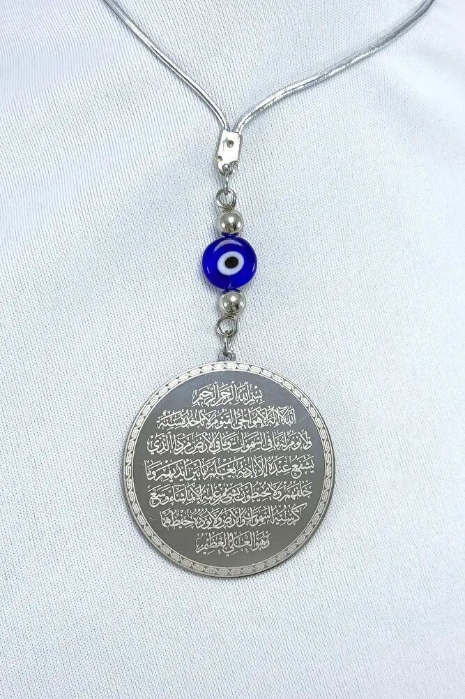 Dualar lazer kazıma tekniği ile kalıcı bir şekilde kazınmaktadır.; Yassı nazar boncuğu el yapımı camdır.; Çelik plaka tek taraflıdır.; Ayetel Kürsi duası bulunmaktadır.; Ürün el yapımıdır el yapımı olduğu için ufak farklılık ve düzensizlikler olasıdır.; İp elastiktir.; Elastik olduğu için her modele rahatlıkla takılabilmektedir.; Plaka gümüş renkli paslanmaz çeliktir.; Çelik plaka 4,5 cm ölçülerindedir.; Ayetel Kürsi, İslam inancında en güçlü ve koruyucu dualardan biri olarak kabul edilir.; Ayetel Kürsi, Allah’ın büyüklüğünü ve egemenliğini ifade eden bir ayet olup, koruma ve manevi güç sağlamak amacıyla sıkça okunur.; Bu ayet, göklerde ve yerin her şeyinin Allah’a ait olduğunu vurgular ve şeytani etkilerden korunma sağlar.; Özellikle gece yatmadan önce okunmasının, güvende olma, zararlı enerjilerden korunma ve ruhsal huzur sağlama açısından büyük fayda verdiğine inanılır.; Aynı zamanda, Allah’ın her şeyi bildiği ve her şeyin O’na bağlı olduğu inancı ile kişiye manevi rahatlık ve güç verir.;