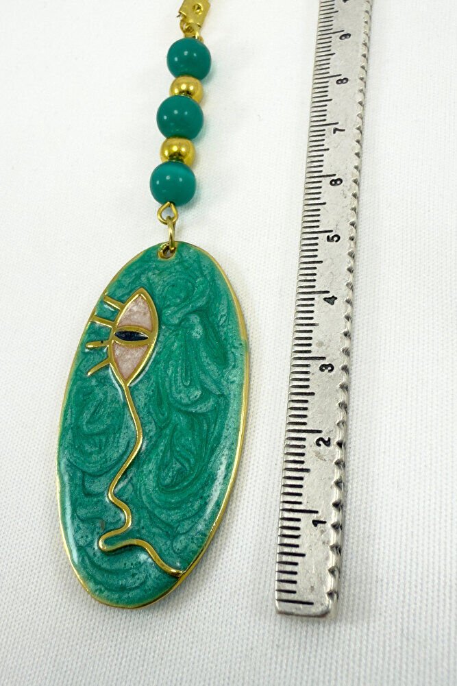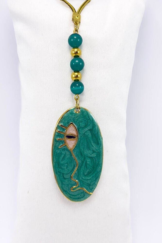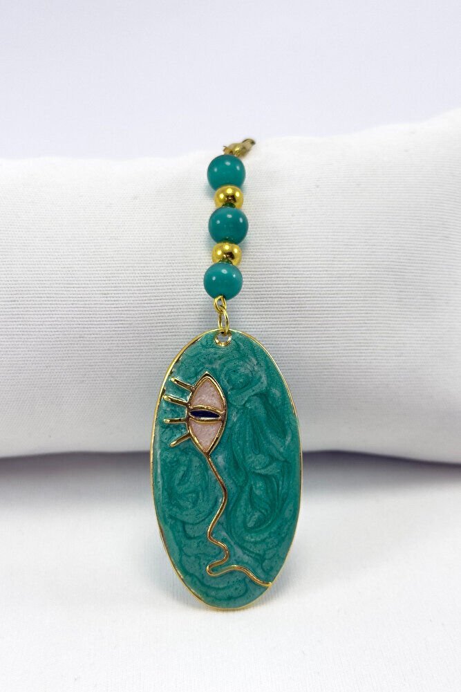 Gold renk ip elastiktir.; Ürün el yapımıdır.; El yapımı olduğu için ufak farklılık ve düzensizlikler olasıdır.; Yeşil plaka metaldir ve 5 cm boyunda ve 3 cm genişliğindedir.; Plaka tek taraflıdır.; arkasında aynı figür bulunmamaktadır.; Boncuklar yeşildir gün ışığında renk değiştirmektedir.; Ürünün yapılı hali lastikli ipi hariç 9 cm ölçülerindedir.; Line art yüz figürü, minimal çizgilerle oluşturulan bir insan yüzüdür ve genellikle sadelik, zarafet ve derin anlamlar taşır.; Bu tarz tasarımlar, insan ruhunun ve duyguların özünü yansıtarak sanatsal ve estetik bir ifade sunar.; Özellikle soyut ve modern sanatın bir parçası olarak, bireyselliği, içsel huzuru veya evrensel insan deneyimini simgeler.