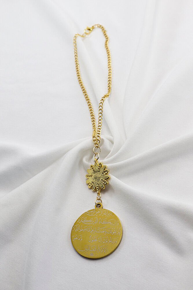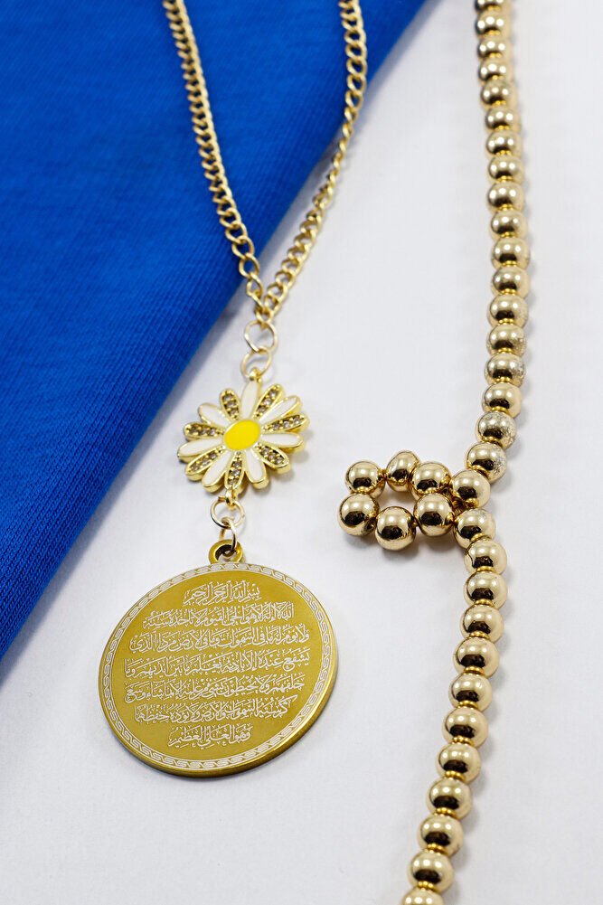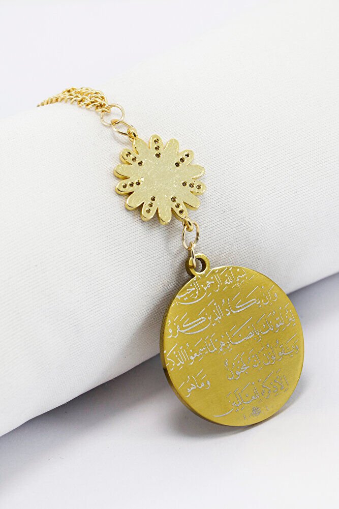 Dualar lazer kazıma tekniği ile kalıcı bir şekilde kazınmaktadır.; Zirkon taşlı papatya tek taraflıdır.; Ayetel Kürsi yazılı yüzünde bulunmaktadır.; Ürün el yapımıdır el yapımı olduğu için ufak farklılık ve düzensizlikler olasıdır.; Zincir ayarlanabilir.; Elastik olduğu için her modele rahatlıkla takılabilmektedir.; Plaka altın renkli paslanmaz çeliktir.; Plaka 316L paslanmaz çeliktir, 3,5 cm ölçülerindedir.; Plaka çift taraflıdır.; Bir yüzünde Ayetel Kürsi diğer yüzünde ise Nazar Ayeti bulunmaktadır.; Nazar ayeti, İslam inancında kötü gözlerden ve olumsuz enerjilerden korunmak amacıyla okunan özel bir duadır.; İnanılır kabul edilir ki, nazar, bir kişinin üzerinde kötü niyetle bakılması sonucu, o kişinin hayatına olumsuz etkiler ve şanssızlık getirebilir.; Nazar ayeti, Allah ın korumasına sığınarak, kişinin bu tür olumsuz etkilerden korunmasını sağlar.; Ayrıca, nazarın kişiye zarar vermemesi için Allah ın kudretine ve ilahi gücüne olan inancı güçlendirir.; Bu dua, zihinsel huzur ve manevi güç sağladığına inanılır, bu nedenle sıkça evlerde, iş yerlerinde veya kişisel eşyalar üzerinde okunur.; Ayetel Kürsi, İslam inancında en güçlü ve koruyucu dualardan biri olarak kabul edilir.; Ayetel Kürsi, Allah ın büyüklüğünü ve egemenliğini ifade eden bir ayet olup, koruma ve manevi güç sağlamak amacıyla sıkça okunur.; Bu ayet, göklerde ve yerin her şeyinin Allah a ait olduğunu vurgular ve şeytani etkilerden korunma sağlar.; Özellikle gece yatmadan önce okunmasının, güvende olma, zararlı enerjilerden korunma ve ruhsal huzur sağlama açısından büyük fayda verdiğine inanılır.; Aynı zamanda, Allah ın her şeyi bildiği ve her şeyin O na bağlı olduğu inancı ile kişiye manevi rahatlık ve güç verir.;