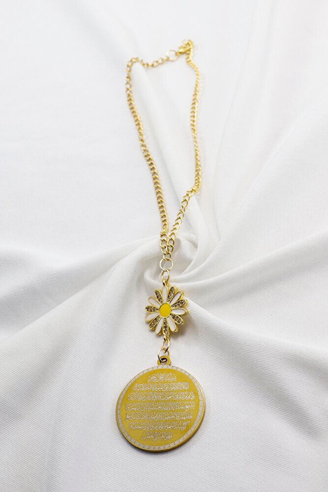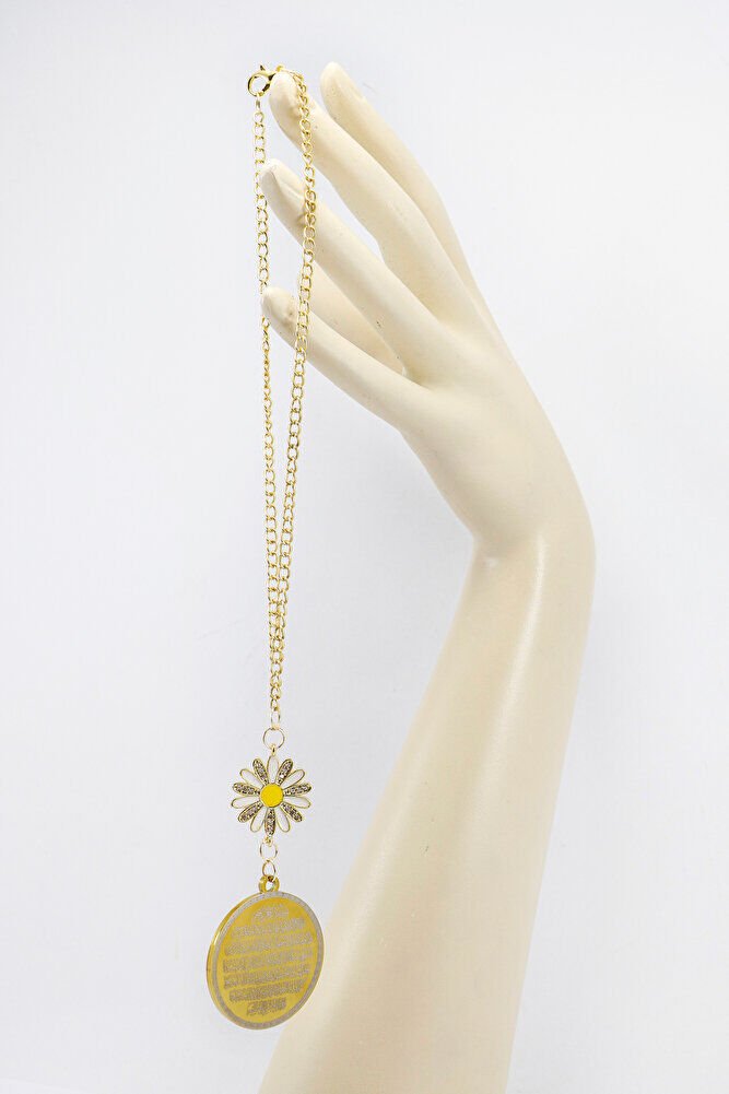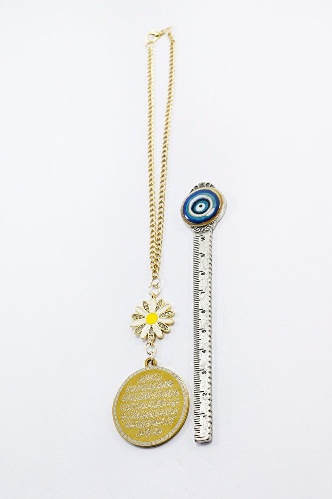 Zirkon Papatyalı Gold Çelik Çift Taraflı Ayetel Kürsi/ Nazar Ayeti Araba Dikiz Ayna Süsü Zincirli