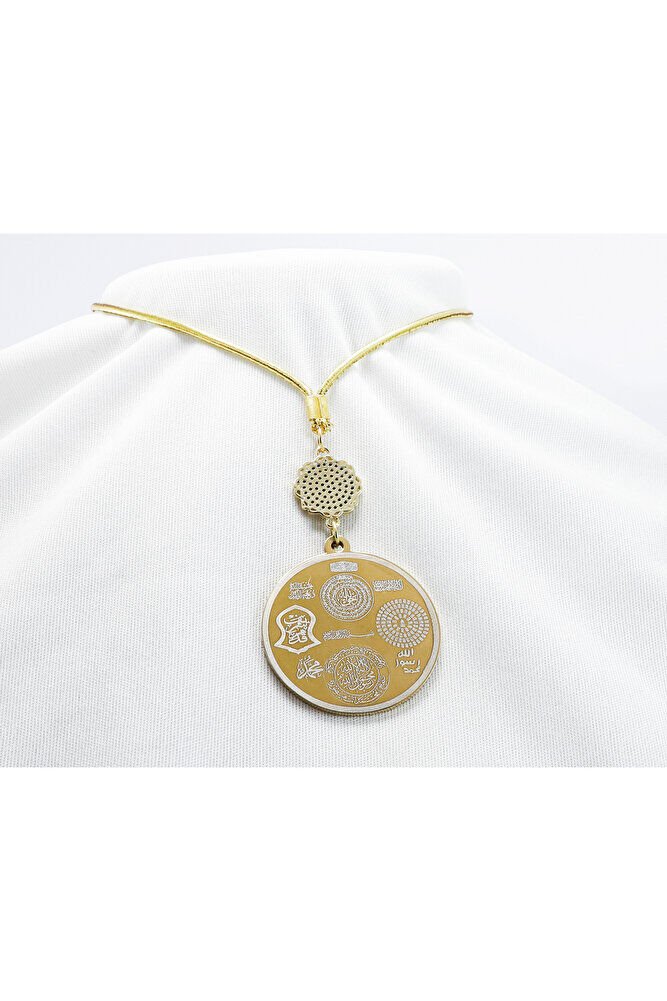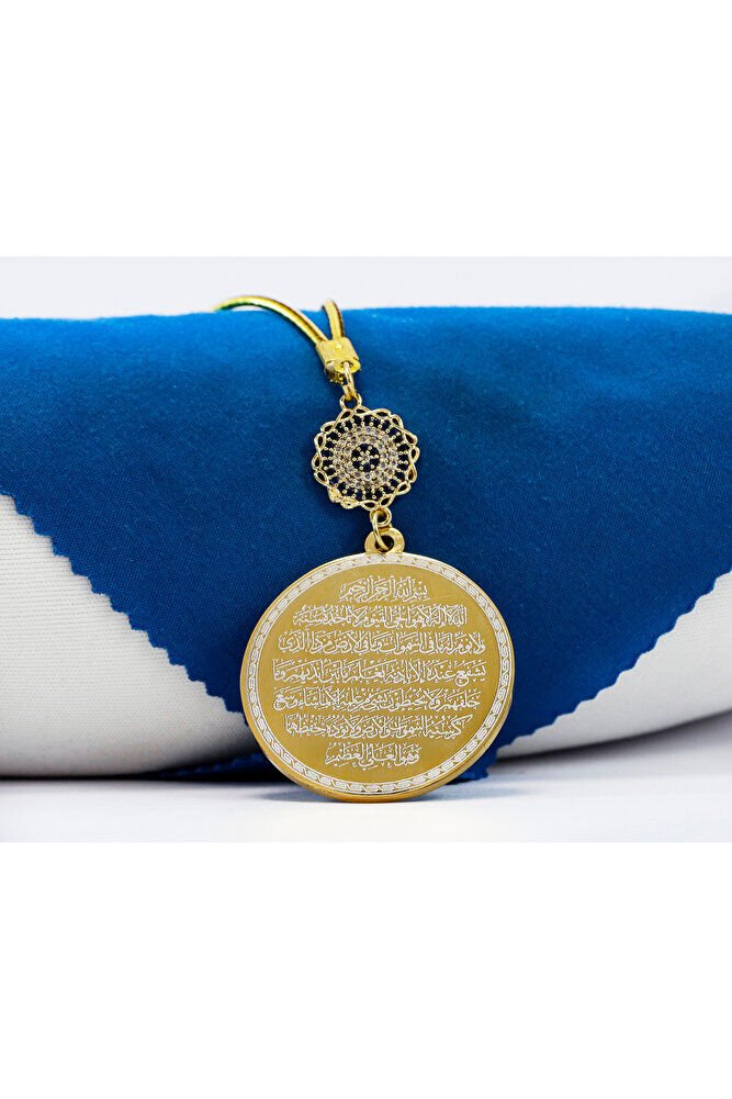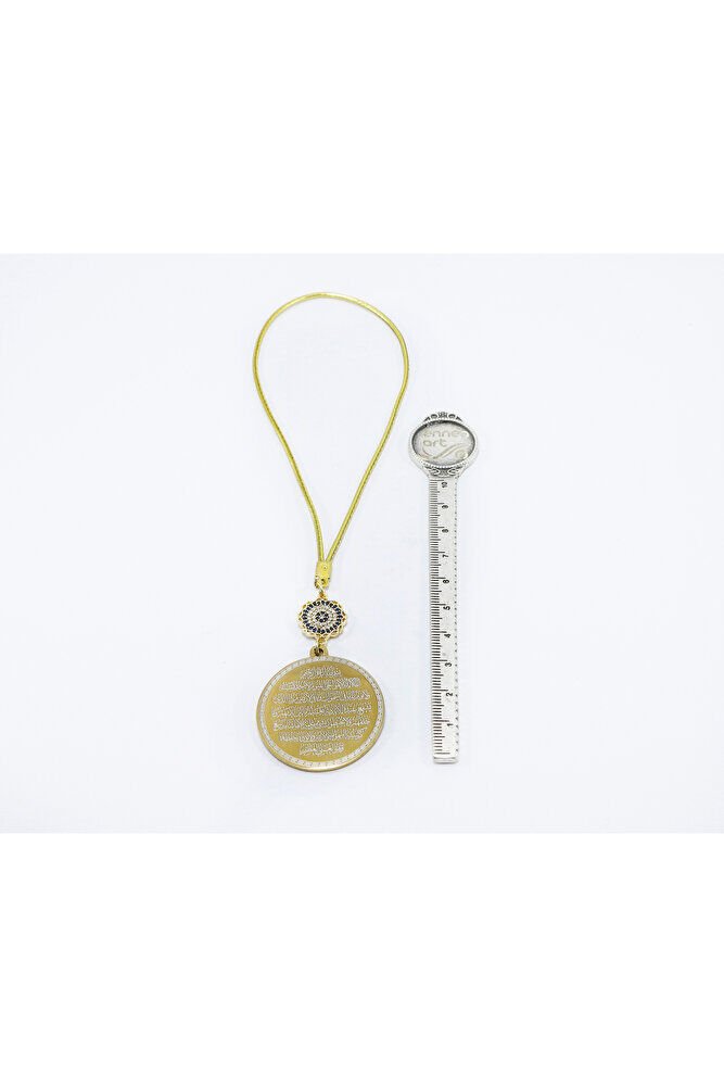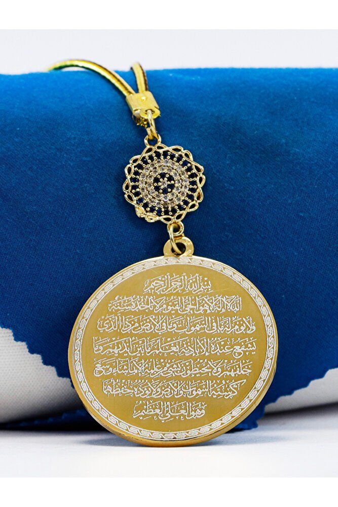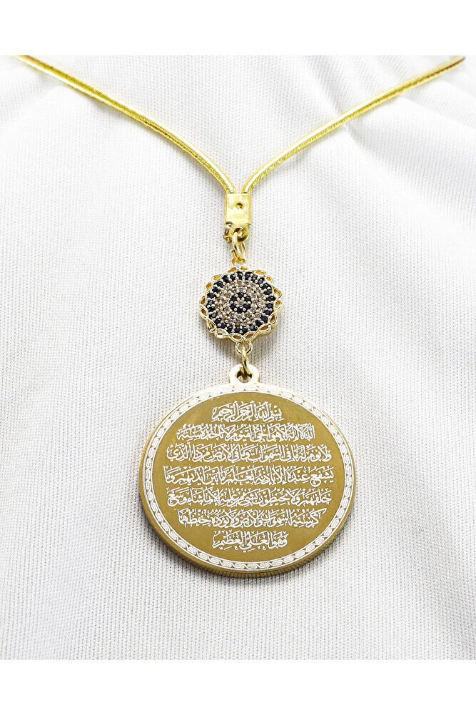 Dualar lazer kazıma tekniği ile kalıcı bir şekilde kazınmaktadır.; parlak taşlı nazar sonsuzluk tek taraflıdır.; Ayetel Kürsi yazılı tarafında bulunmaktadır.; Ürün el yapımıdır el yapımı olduğu için ufak farklılık ve düzensizlikler olasıdır.; İp elastiktir.; Elastik olduğu için her modele rahatlıkla takılabilmektedir.; Plaka altın renkli paslanmaz çeliktir.; Bağlantı materyelleri dayanıklı altın kaplamadır.; Çelik plaka 3,5 cm ölçülerindedir.; Plaka çift taraflıdır.; Bir yüzünde Ayetel Kürsi diğer yüzünde ise Felak Nas İhlas bulunmaktadır.; Felak, Nas ve İhlas sureleri, İslam inancında korunma ve manevi güç sağlamak için okunan önemli dualardır.; İnanılır kabul edilir ki, Felak ve Nas sureleri, özellikle kötü gözlerden, nazardan ve şeytani etkilerden korunmak için okunur.; Felak suresi, karanlık güçlere karşı koruma sağlarken, Nas suresi de olumsuz düşünceler ve zararlı enerjilerden korunmayı sağlar.; İhlas suresi ise, Allah ın birliğini ve sınırsız gücünü ifade eder, bu sureye inanılır ki, kişi manevi huzur ve Allah ın koruması altında olur.; Bu sureler, sıkça güven ve huzur arayışında olanlar için okunur ve ruhsal dengeyi sağlamak isteyenlere büyük fayda sağladığına inanılır.; Ayetel Kürsi, İslam inancında en güçlü ve koruyucu dualardan biri olarak kabul edilir.; Ayetel Kürsi, Allah ın büyüklüğünü ve egemenliğini ifade eden bir ayet olup, koruma ve manevi güç sağlamak amacıyla sıkça okunur.; Bu ayet, göklerde ve yerin her şeyinin Allah a ait olduğunu vurgular ve şeytani etkilerden korunma sağlar.; Özellikle gece yatmadan önce okunmasının, güvende olma, zararlı enerjilerden korunma ve ruhsal huzur sağlama açısından büyük fayda verdiğine inanılır.; Aynı zamanda, Allah ın her şeyi bildiği ve her şeyin O na bağlı olduğu inancı ile kişiye manevi rahatlık ve güç verir.;