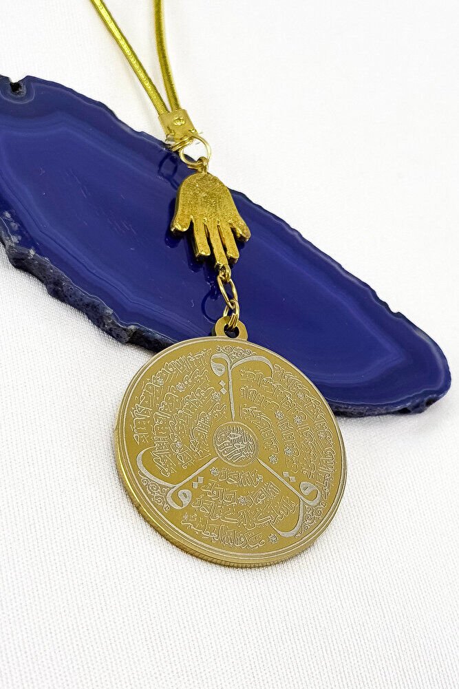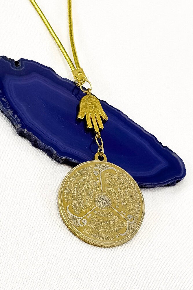 Dualar lazer kazıma tekniği ile kalıcı bir şekilde kazınmaktadır.; Zirkon taşlı hamse eli metaldir ve tek taraflıdır.; Ürün el yapımıdır el yapımı olduğu için ufak farklılık ve düzensizlikler olasıdır.; İp elastiktir.; Elastik olduğu için her modele rahatlıkla takılabilmektedir.; Plaka altın renkli paslanmaz çeliktir.; Çelik plaka 3,5 cm ölçülerindedir.; Plaka çift taraflıdır.; Bir yüzünde Ayetel Kürsi diğer yüzünde ise Felak Nas İhlas bulunmaktadır.; Felak, Nas ve İhlas sureleri, İslam inancında korunma ve manevi güç sağlamak için okunan önemli dualardır.; İnanılır kabul edilir ki, Felak ve Nas sureleri, özellikle kötü gözlerden, nazardan ve şeytani etkilerden korunmak için okunur.; Felak suresi, karanlık güçlere karşı koruma sağlarken, Nas suresi de olumsuz düşünceler ve zararlı enerjilerden korunmayı sağlar.; İhlas suresi ise, Allah ın birliğini ve sınırsız gücünü ifade eder, bu sureye inanılır ki, kişi manevi huzur ve Allah ın koruması altında olur.; Bu sureler, sıkça güven ve huzur arayışında olanlar için okunur ve ruhsal dengeyi sağlamak isteyenlere büyük fayda sağladığına inanılır.; Ayetel Kürsi, İslam inancında en güçlü ve koruyucu dualardan biri olarak kabul edilir.; Ayetel Kürsi, Allah ın büyüklüğünü ve egemenliğini ifade eden bir ayet olup, koruma ve manevi güç sağlamak amacıyla sıkça okunur.; Bu ayet, göklerde ve yerin her şeyinin Allah a ait olduğunu vurgular ve şeytani etkilerden korunma sağlar.; Özellikle gece yatmadan önce okunmasının, güvende olma, zararlı enerjilerden korunma ve ruhsal huzur sağlama açısından büyük fayda verdiğine inanılır.; Aynı zamanda, Allah ın her şeyi bildiği ve her şeyin O na bağlı olduğu inancı ile kişiye manevi rahatlık ve güç verir.;
