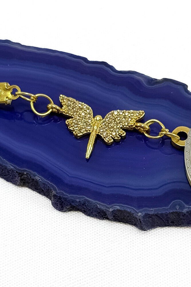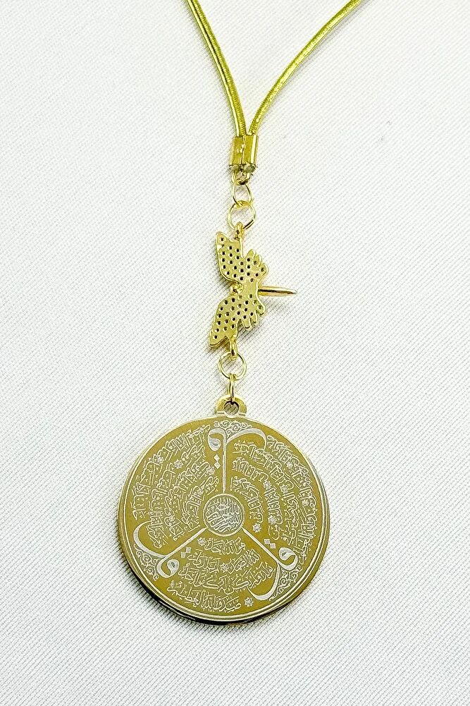 Dualar lazer kazıma tekniği ile kalıcı bir şekilde kazınmaktadır.; Zirkon taşlı kelebek metaldir ve tek taraflıdır.; Ürün el yapımıdır el yapımı olduğu için ufak farklılık ve düzensizlikler olasıdır.; İp elastiktir.; Elastik olduğu için her modele rahatlıkla takılabilmektedir.; Plaka altın renkli paslanmaz çeliktir.; Çelik plaka 3,5 cm ölçülerindedir.; Plaka çift taraflıdır.; Bir yüzünde Ayetel Kürsi diğer yüzünde ise Felak Nas İhlas bulunmaktadır.; Felak, Nas ve İhlas sureleri, İslam inancında korunma ve manevi güç sağlamak için okunan önemli dualardır.; İnanılır kabul edilir ki, Felak ve Nas sureleri, özellikle kötü gözlerden, nazardan ve şeytani etkilerden korunmak için okunur.; Felak suresi, karanlık güçlere karşı koruma sağlarken, Nas suresi de olumsuz düşünceler ve zararlı enerjilerden korunmayı sağlar.; İhlas suresi ise, Allah ın birliğini ve sınırsız gücünü ifade eder, bu sureye inanılır ki, kişi manevi huzur ve Allah ın koruması altında olur.; Bu sureler, sıkça güven ve huzur arayışında olanlar için okunur ve ruhsal dengeyi sağlamak isteyenlere büyük fayda sağladığına inanılır.; Ayetel Kürsi, İslam inancında en güçlü ve koruyucu dualardan biri olarak kabul edilir.; Ayetel Kürsi, Allah ın büyüklüğünü ve egemenliğini ifade eden bir ayet olup, koruma ve manevi güç sağlamak amacıyla sıkça okunur.; Bu ayet, göklerde ve yerin her şeyinin Allah a ait olduğunu vurgular ve şeytani etkilerden korunma sağlar.; Özellikle gece yatmadan önce okunmasının, güvende olma, zararlı enerjilerden korunma ve ruhsal huzur sağlama açısından büyük fayda verdiğine inanılır.; Aynı zamanda, Allah ın her şeyi bildiği ve her şeyin O na bağlı olduğu inancı ile kişiye manevi rahatlık ve güç verir.;