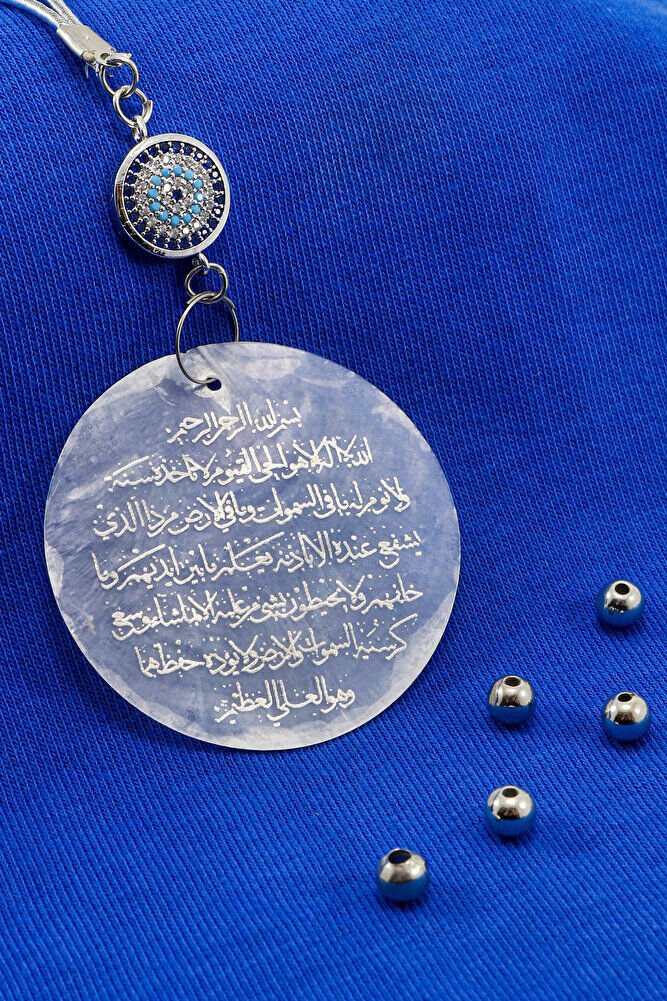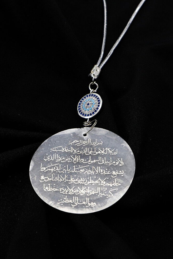 Ürün tamamen el yapımıdır.; Zirkon taşlı nazar tek taraflıdır.; plaka 5 cm dir.; Lazer kazıma yöntemiyle Ayetel Kürsi Duası yazılmıştır.; Ayetel Kürsi, İslam inancında en güçlü ve koruyucu dualardan biri olarak kabul edilir.; Ayetel Kürsi, Allah’ın büyüklüğünü ve egemenliğini ifade eden bir ayet olup, koruma ve manevi güç sağlamak amacıyla sıkça okunur.; Bu ayet, göklerde ve yerin her şeyinin Allah’a ait olduğunu vurgular ve şeytani etkilerden korunma sağlar.; Özellikle gece yatmadan önce okunmasının, güvende olma, zararlı enerjilerden korunma ve ruhsal huzur sağlama açısından büyük fayda verdiğine inanılır.; Aynı zamanda, Allah’ın her şeyi bildiği ve her şeyin O’na bağlı olduğu inancı ile kişiye manevi rahatlık ve güç verir.; İpi lastiklidir.; Lastikli olduğu için her model araca rahatlıkla takılabilmektedir.; plaka tek taraflıdır.;