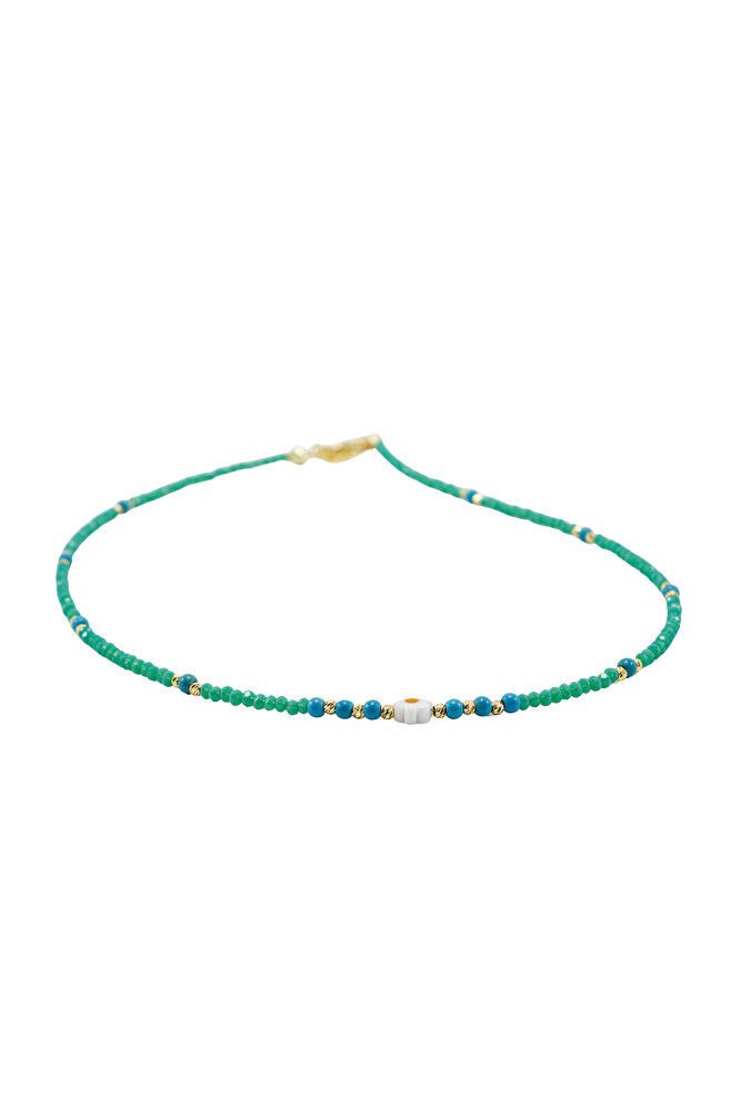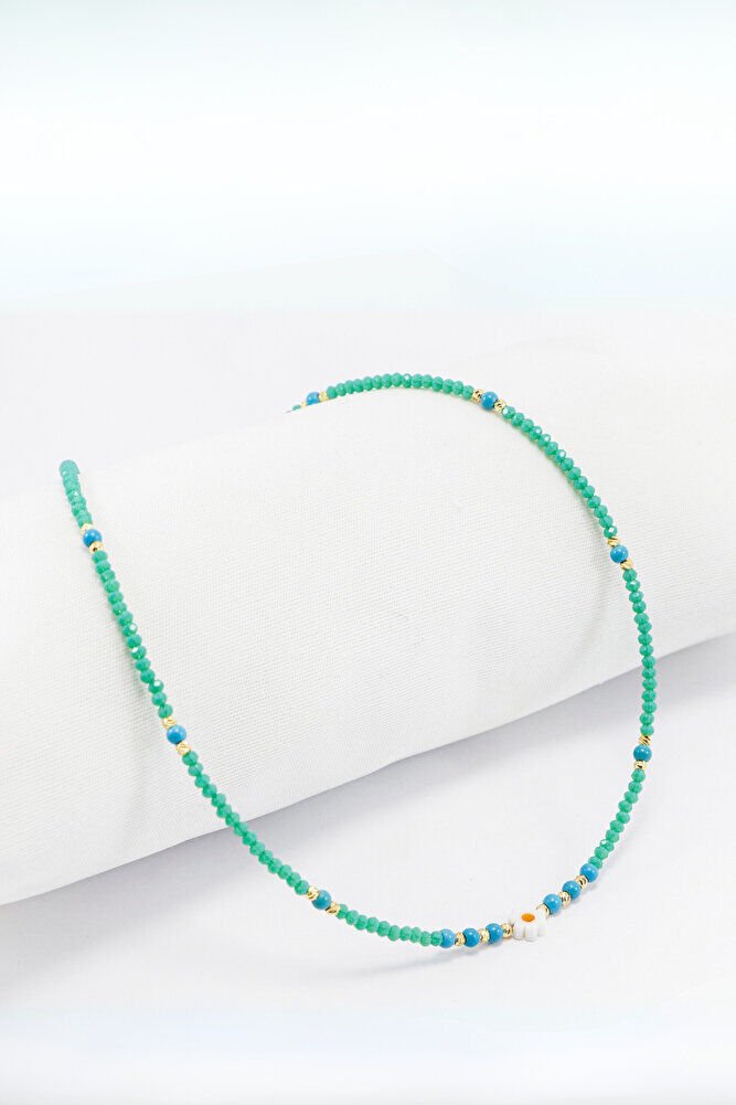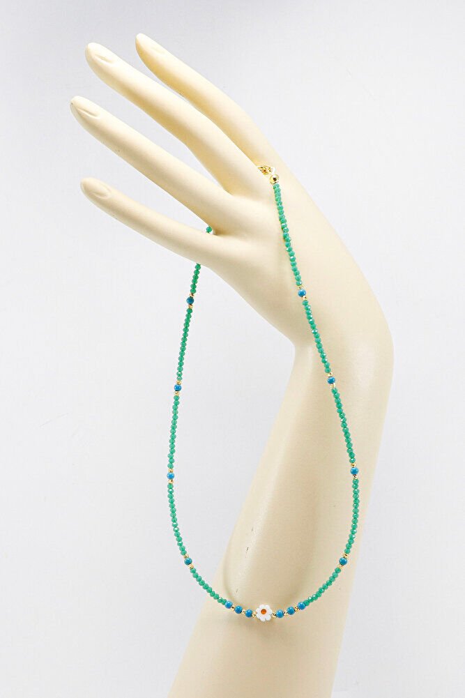 Zümrüt Yeşili Kum Boncuklu Papatyalı Bijuteri Kolye, Hediyelik Kolye